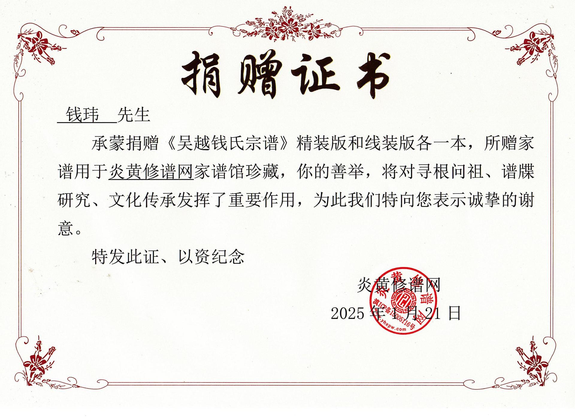 钱玮先生慷慨捐赠《吴越钱氏宗谱》,助力炎黄修谱网续写家族辉煌