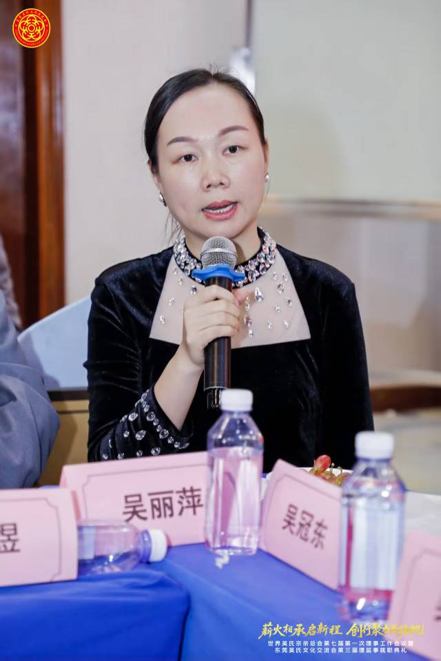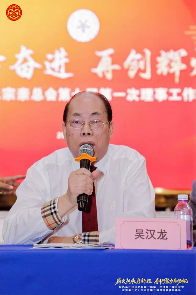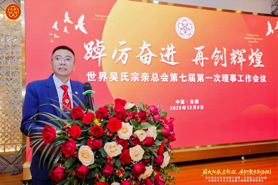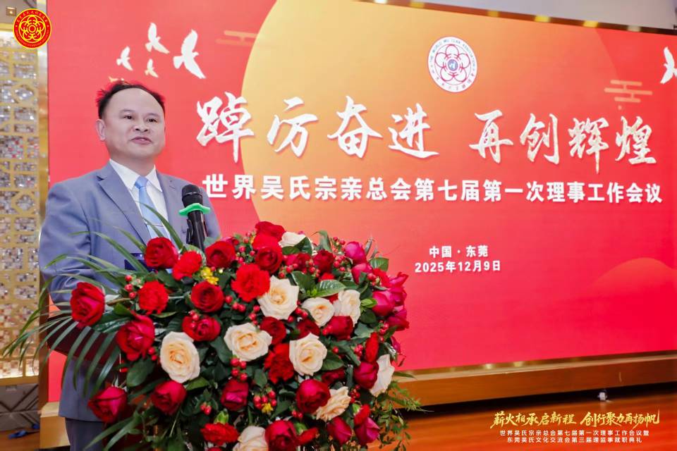 2025年12月9日下午,七届世吴总会第一次理事工作会议在东莞市常平镇隐贤山庄顺利召开,来自全球各地的吴氏宗亲代表齐聚一堂,共叙宗谊,共商大计。会议由七届世吴总会常务副主席兼秘书长吴雷宗长主持,七届世吴总会执行主席受吴汉龙主席委托执行主席吴虹渊代作工作报告,七届世吴总会常务副主席兼财务总监吴小能宗长作财务报告,会上七届世吴总会常务副主席兼文化委员会执行主任吴志云宗长宣读了相关任职文件,以及对提出合理化建议表彰的18个单位和授予48个先进单位荣誉称号的决定,贵州远口吴氏总祠同时得到合理化建议奖和先进单位的荣誉表彰。会上吴位清和吴光才两位会长分别给大家介绍了贵州泰伯文化研究会以商养会的发展规划和具体运营方案以及远口总祠和远口泰伯书院一年以来的工作和取得的成果,今后的工作愿景。最后由吴雷秘书长作总结,本次会议成果丰硕,明确了未来的工作蓝图,呼吁全球吴氏宗亲携手共进,将会议共识转化为实际行幼、共同开创宗亲事业新局面。
