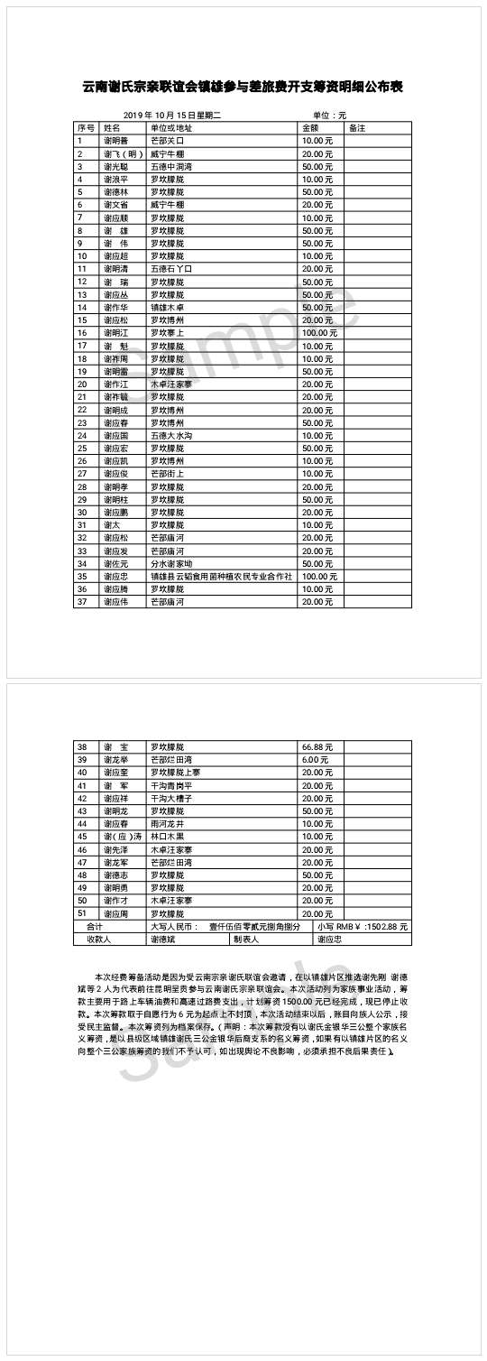 以下为比喜谢氏威信片区、分水片区筹资明细: