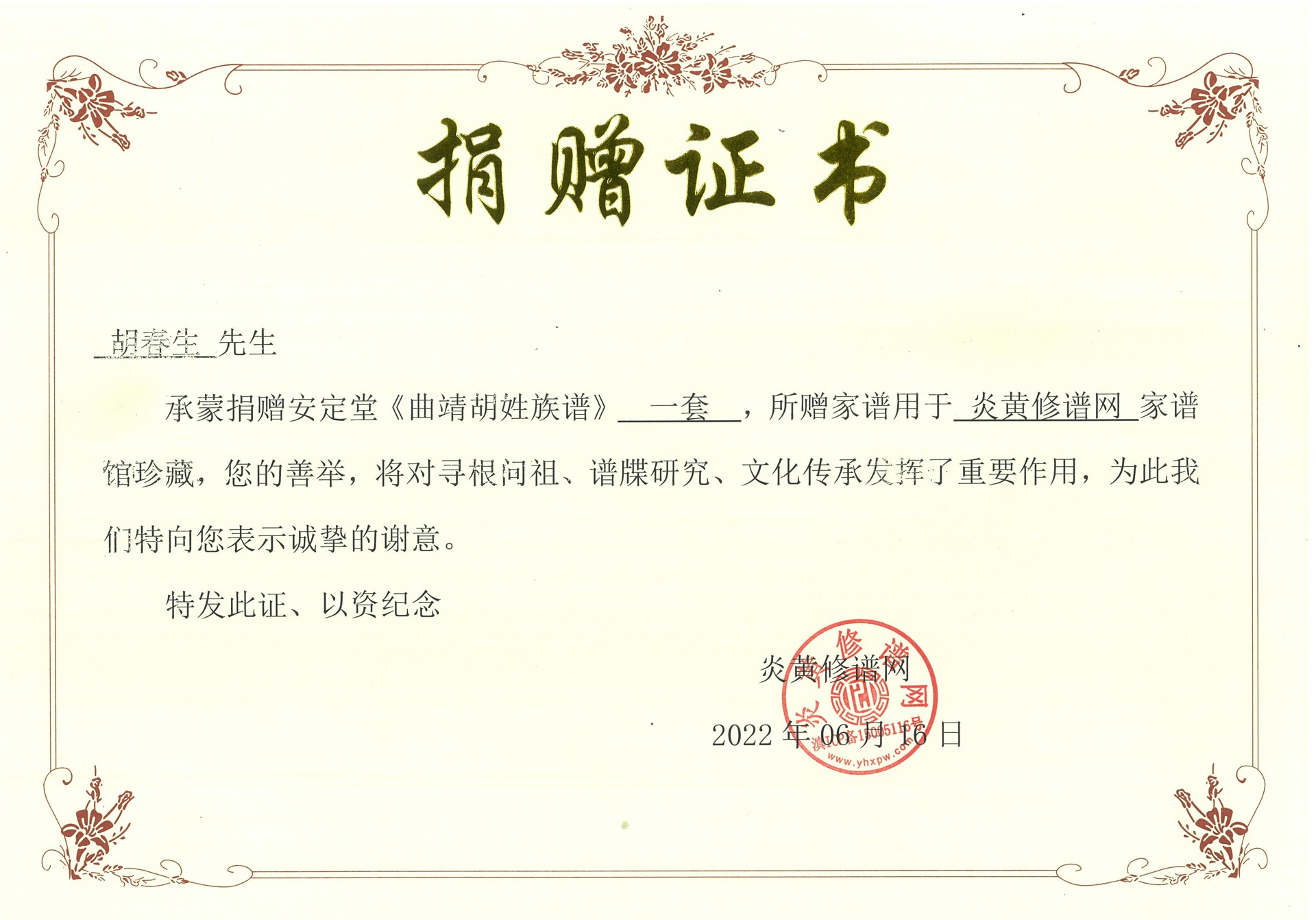 2022年6月16日,胡春生先生向炎黄修谱网捐赠《曲靖胡姓族谱》一套,本家谱为两册(第一册、第二册),是胡姓族人历经五年时间,于2014年年底完成的家谱,本家谱承上启下,上至黄帝,下至2014年,共七章1400千字,是200多胡姓族人参与者的心血和汗水的结晶,炎黄修谱网一定好好收藏,并对胡春生先生赠送家谱及付元方老师的引荐表示感谢。