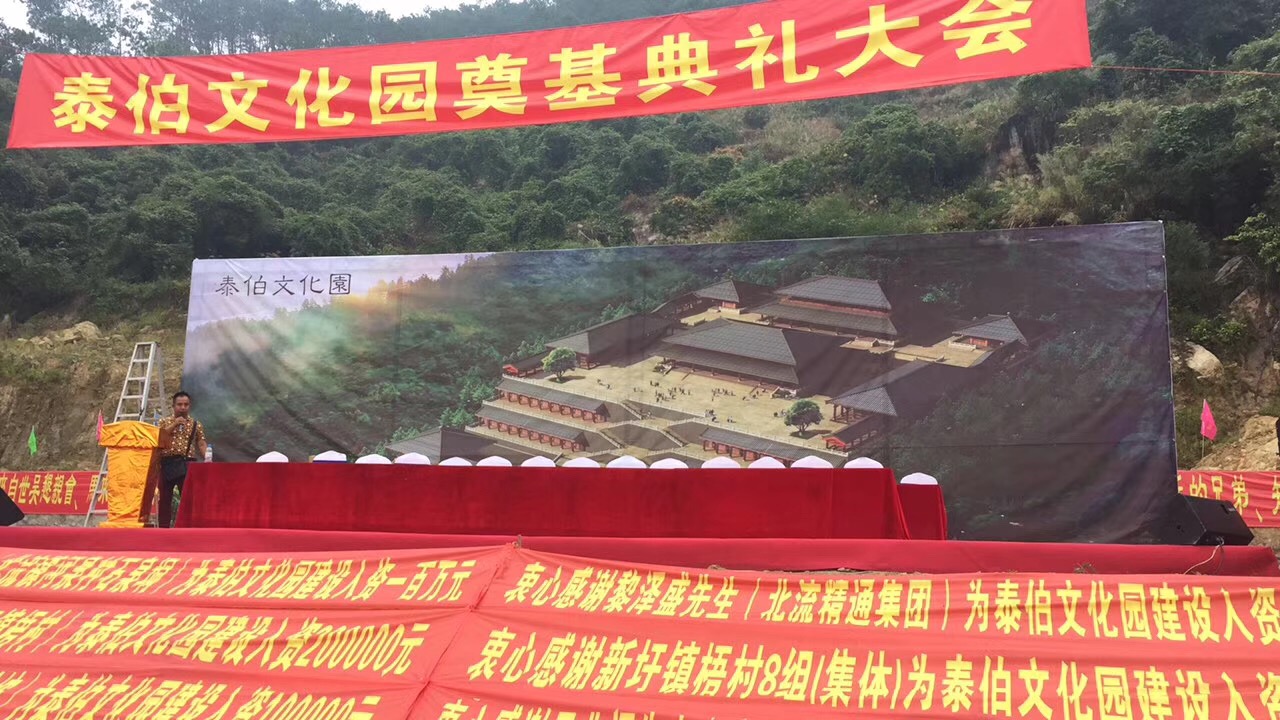 为了使族人和外姓人更好地了解泰伯文化,广西吴氏联谊会计划筹资2.1亿元在广西北流市新圩镇梧村狮子峰生态文化旅游区内建设广西泰伯文化园,2017年11月13日举行了开工典礼仪式。广西泰伯文化园占地12240平方米,规模宏大,由前广场、门楼、角楼和六大殿组成的。(吴忠供图)