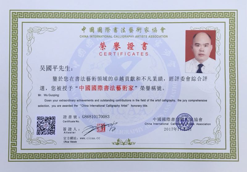 个人简介:吴国平,男,笔名瀚文。1970年生,祖籍广东河源市龙川县人。自上世纪八十年代未开始书法。现为中国国际书法艺术家协会会员。