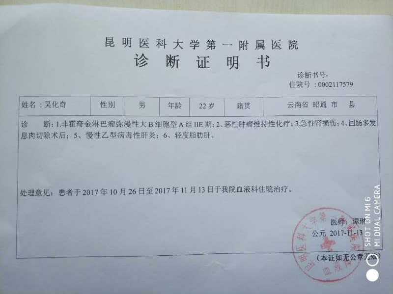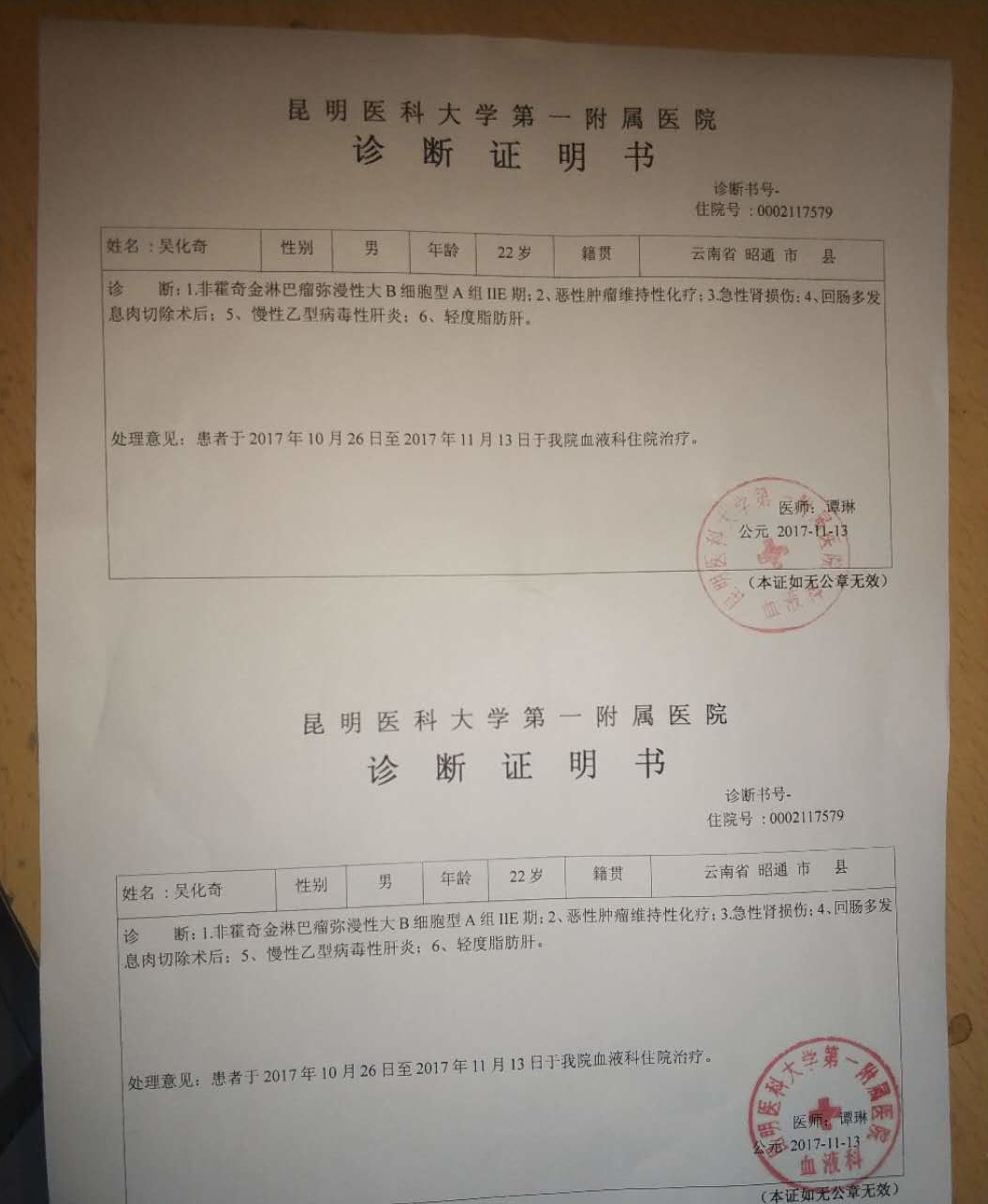 我叫吴化奇,今年22岁,来自云南昭通的一个偏远小山村,是一名昆明理工大学(新迎校区)的在读大学生。七岁母亲因心脏病去世,父亲一个人将我们姐弟三个带大,2016年4月因腹痛到昆明医科大学第一附属医院做了回盲部息肉切除术,最终病检确诊为非霍奇金淋(弥漫性)巴瘤,至今做了十次化疗,已花费十多万。亲戚朋友的都已经被我们借完了,到了最后关头的造血干细胞移植术需要二十多万的费用,但家里实在是拿不出半分钱,也借不到钱了,希望能得到各界爱心人士的帮助。因为爸爸他们要打工挣钱给我治病还账,在我住院的两年间就见过爸爸一次,哪怕是这次移植很有可能生死两隔也忍住没来见我一次。我想再多看看家人,不想再见他们伤心流泪。希望大家多多帮助,大家的恩情我一定铭记在心。谢谢