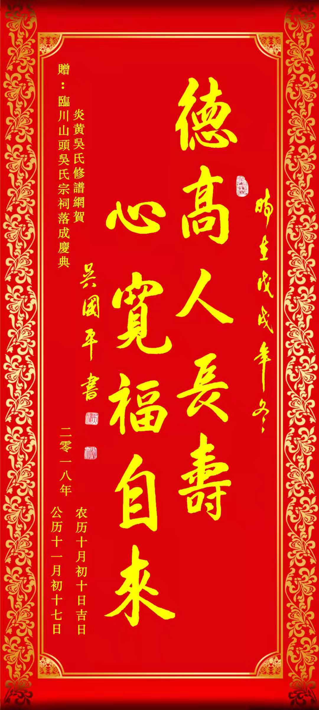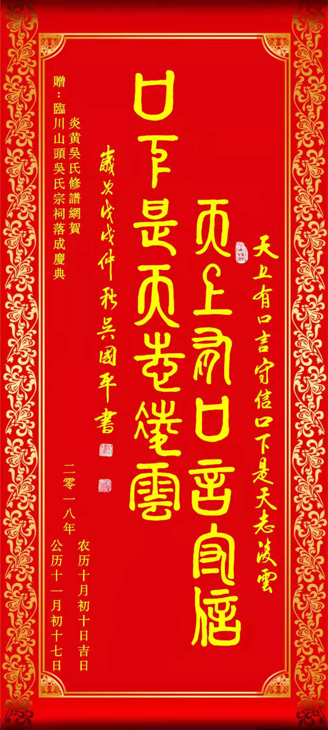 2018年11月17日(农历十月初十日)山头吴氏宗祠的落成,是我们吴氏家族的一件特大喜事,集中地反映了宣公后裔承先启后、枝繁叶茂、继往开来、兴旺发达的精神面貌,也充分体现了宗亲孝悌友爱、团结奋斗、风雨同舟、开拓进取的坚强意志,为吴氏家族增添了新的篇章,这既是山头吴氏宗亲全体人的功绩,也是举国族人共有的光荣,身为吴氏族人我们也感到莫大的自豪与骄傲。
