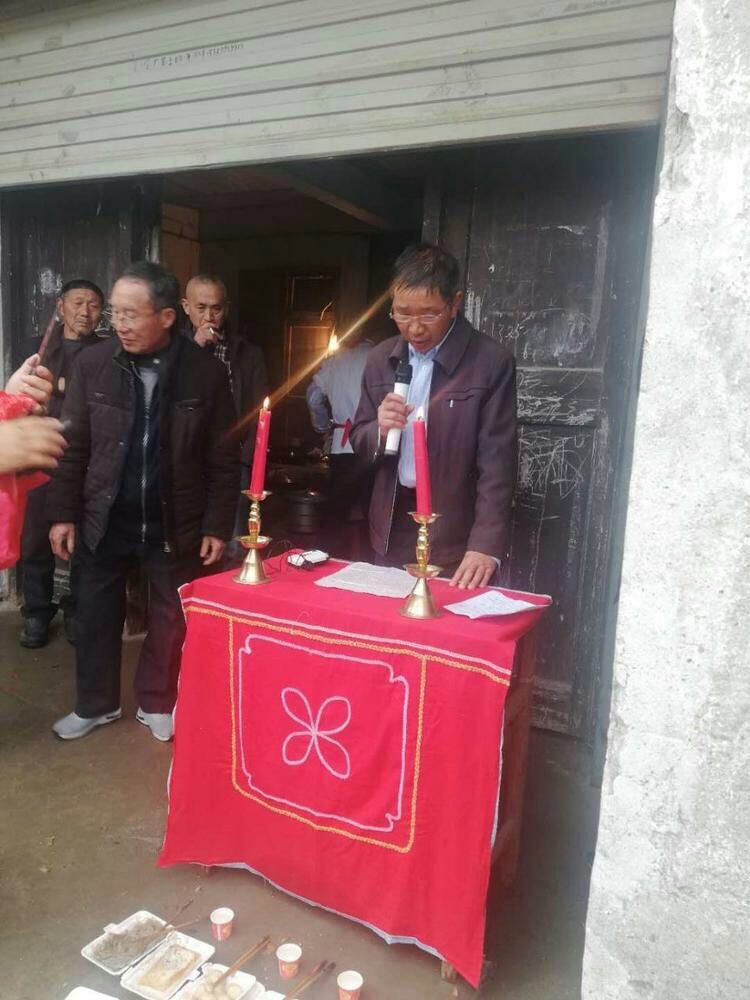 中午时分,在石台的祭拜仪式结束后,所有人员和车辆转入贵池千年古村乌石村,乌石村以吴姓人家为主居住的村庄,有着丰富的民族文化传存,现被池州市评为美好乡村创建村,是梅街镇精神文化建设标兵村,山水乌石人文荟萃。千年乌石的吴氏宗祠,承载着秋浦吴氏家族的辉煌历史。为欢迎来至各地吴氏宗亲到乌石做清明祭拜宗祠故地,乌石提前多日就开始筹划,积极做好各项接待事宜,当日中午便在大礼堂备了20多桌酒席招待宗亲,所有厨师均来至贵池知名酒店,宗亲们有种宾至如归的感觉,大家吃的饱吃的好而不浪费。在祭拜祠堂故址前,举行了隆重的祭拜仪式。