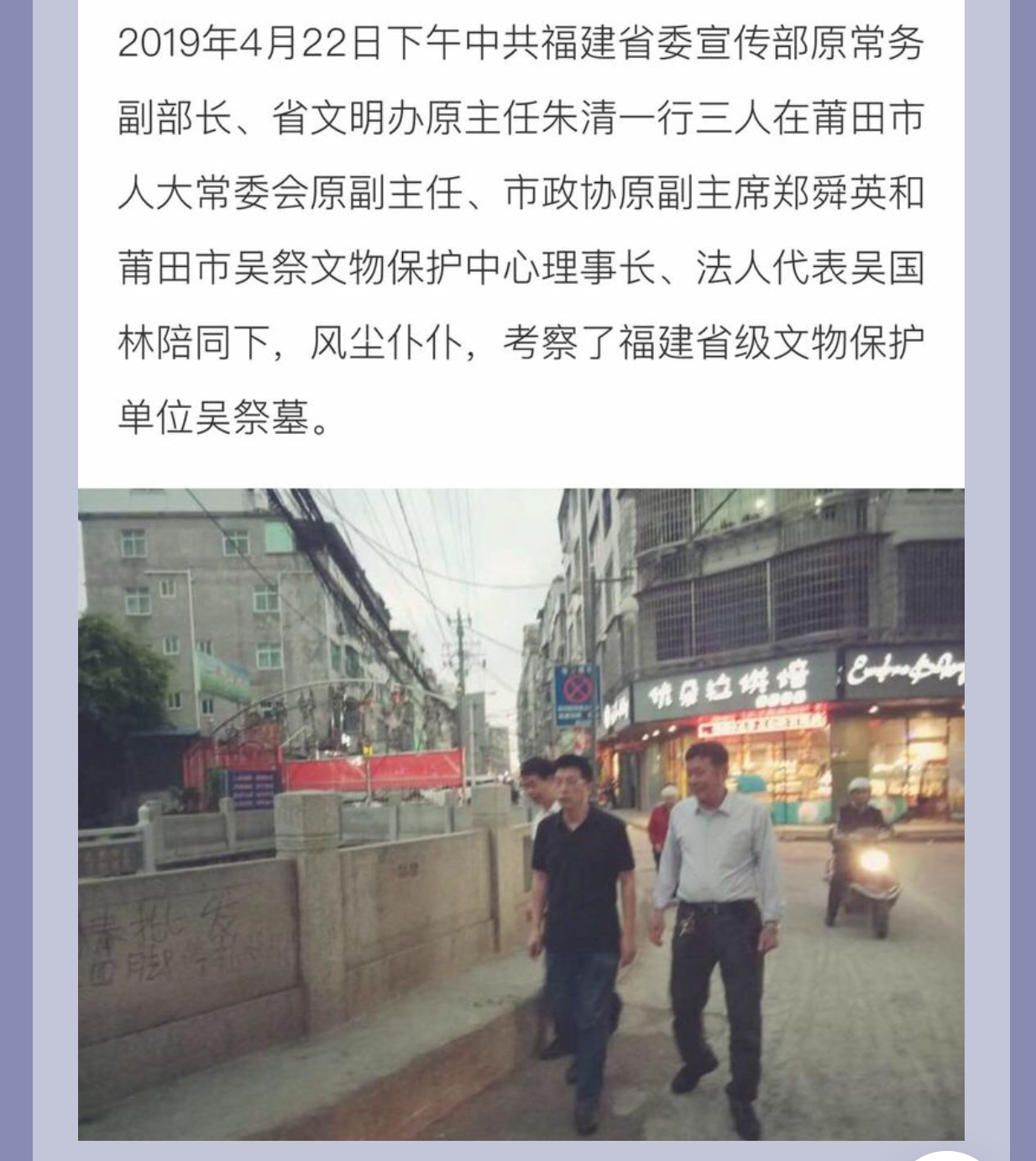 福建省委宣传部原副部长、原文明办朱清一行到吴祭文物保护中心调研