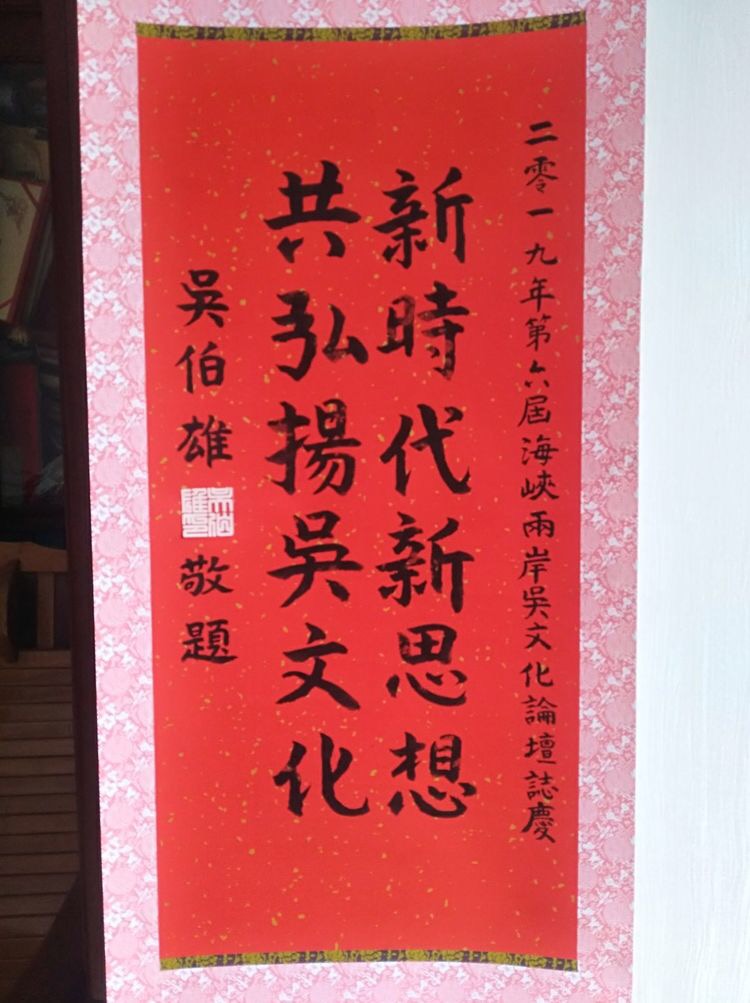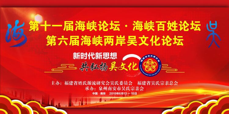 2019年第六届海峡两岸吴文化论坛将于2019年6月13——15日在福建泉州南安市隆重举行,来自两岸的吴氏宗亲与姓氏专家将两岸弘扬传统“吴文化”进行交流。中国国民党荣誉主席吴伯雄特意为论坛题赠墨宝:“新时代新思想,共弘扬吴文化”,以表示祝贺第六届海峡两岸吴文化论坛胜利召开。据悉,海峡两岸吴文化论坛先后已在漳州、石狮、长乐、南平、龙岩举办。第六届海峡两岸吴文化论坛将作为第十一届海峡百姓论坛的分论坛在泉州南安。