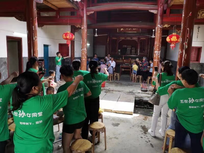 2019年8月18日,江西省龙南县里仁镇上游村柑梓树下吴氏文兴公后嗣外嫁女五世同堂,自发组织回娘家探亲活动。