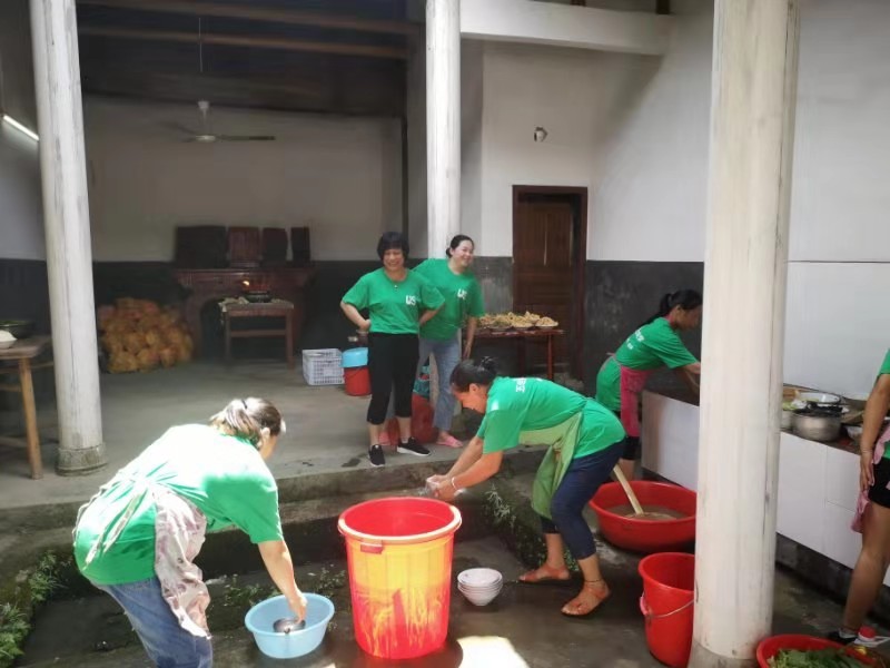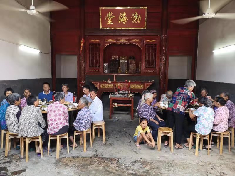 五世外嫁女在娘家的文兴公祠堂自己做酒席,分工明确,秩序井然,桌面菜肴十分丰盛。