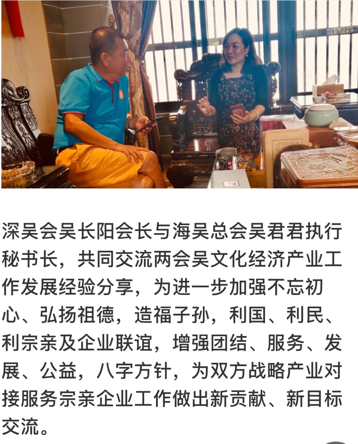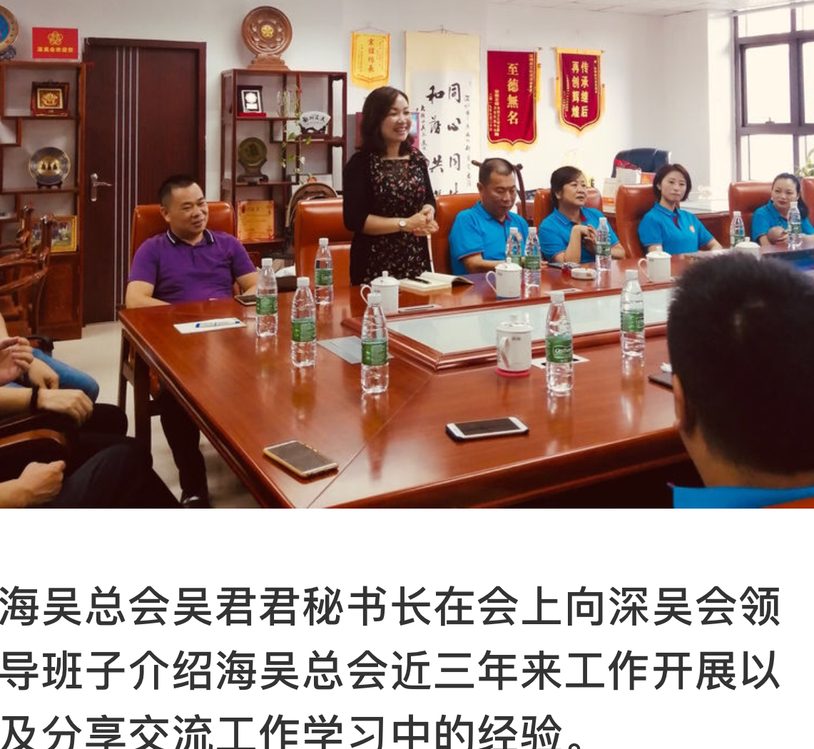 9月19日海吴总会吴君君执行秘书长礼访深圳吴氏宗亲会,不忘初心,砥砺奋进、同心同德。加强宗亲企业文化,心连心,手携手,抱团取暖,共赢发展,感谢深吴会,吴长阳会长及领导班子,各宗亲企业热情接待,增进海吴总会、深吴会两会宗亲企业文化经济产业互联发展,特别感恩长阳会长,不忘初心、群策群力,付出心系宗亲企业,奋发进取精神,是我们家人学习的好榜样,希望两会加强交流,为天下吴氏一家人,团结协作,走向辉煌,为吴文化精神文明建设,创建美好的温馨家园,而共同努力奋斗。在此再次表示感谢对总会秘书处吴君君执行秘书长的热情招待以及深厚的企业文化工作联谊交流。