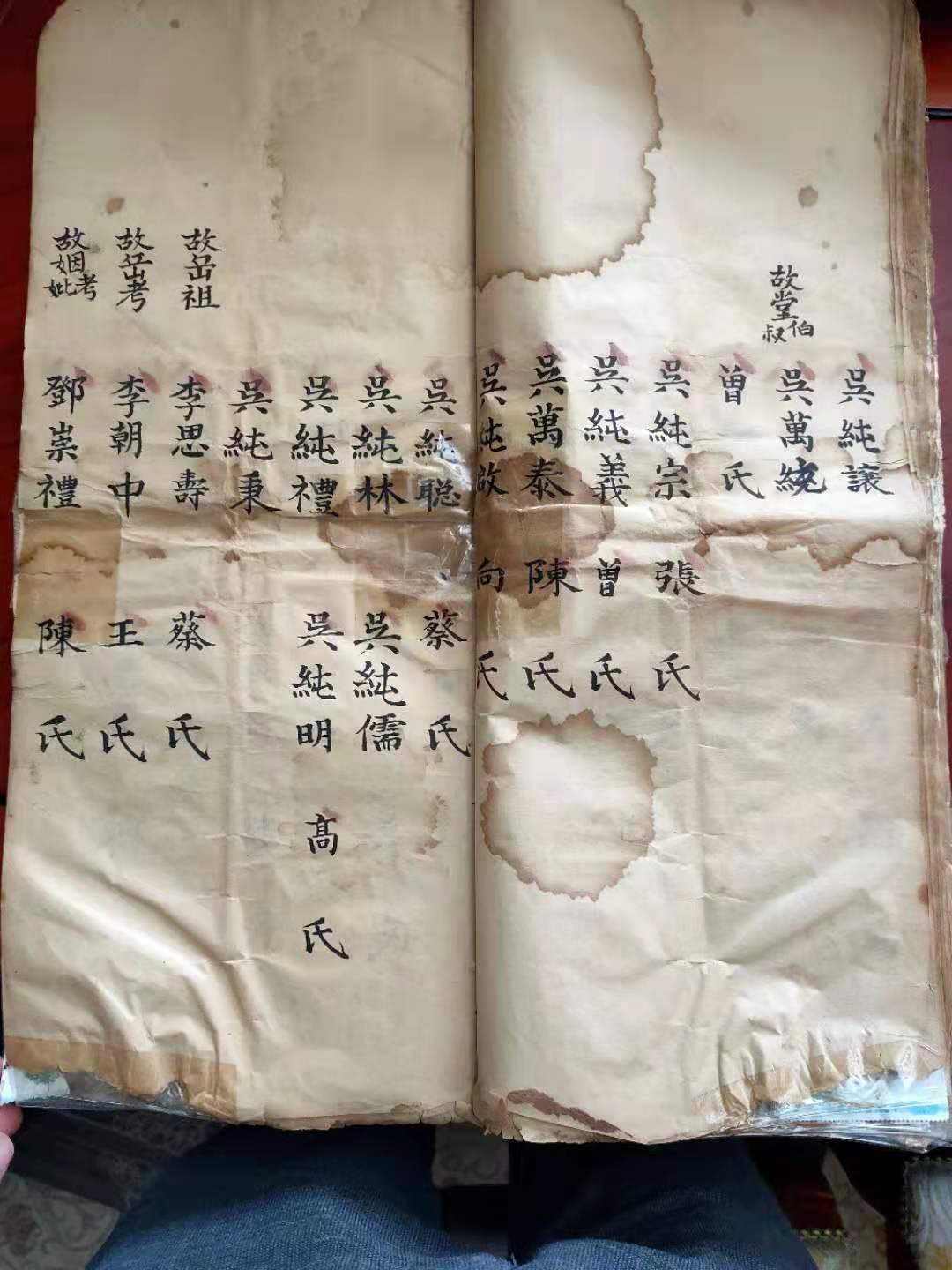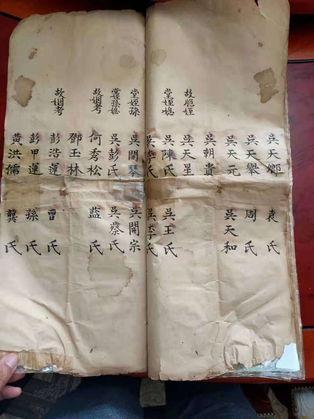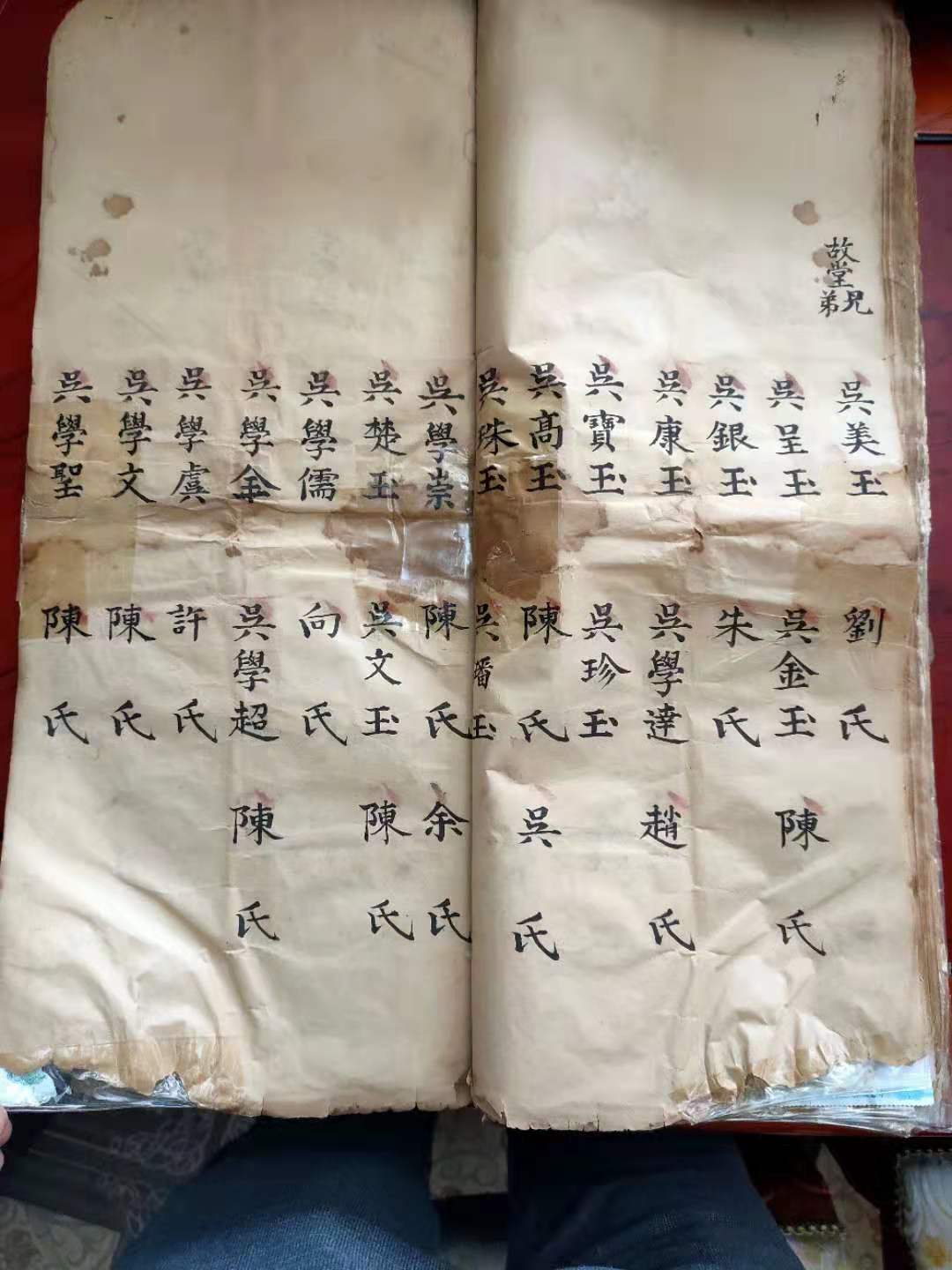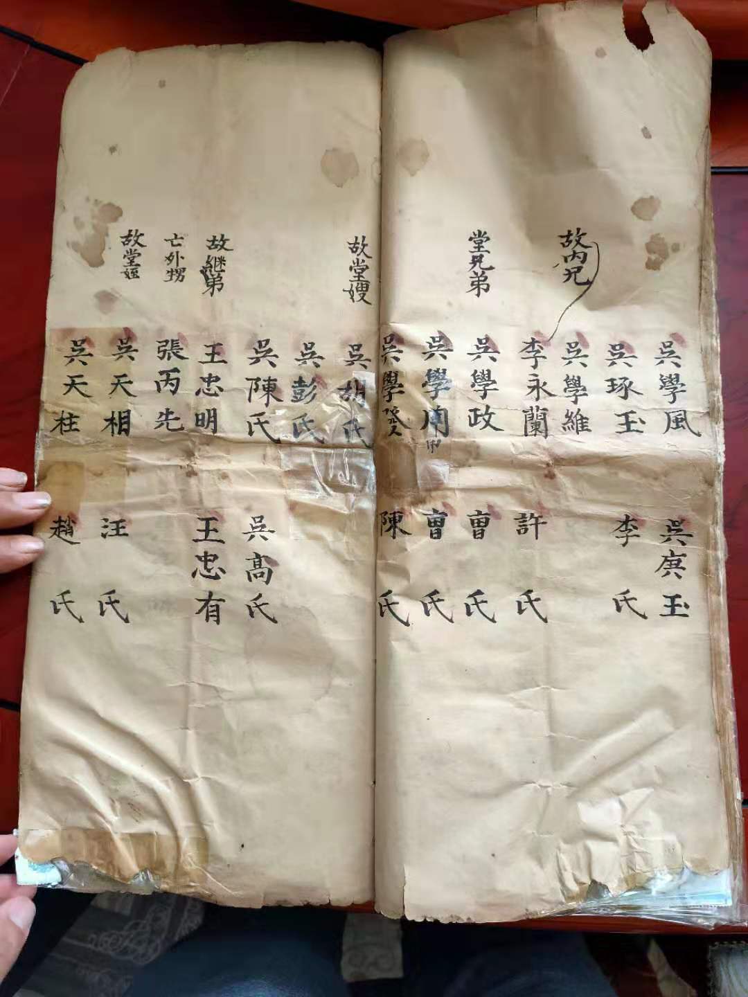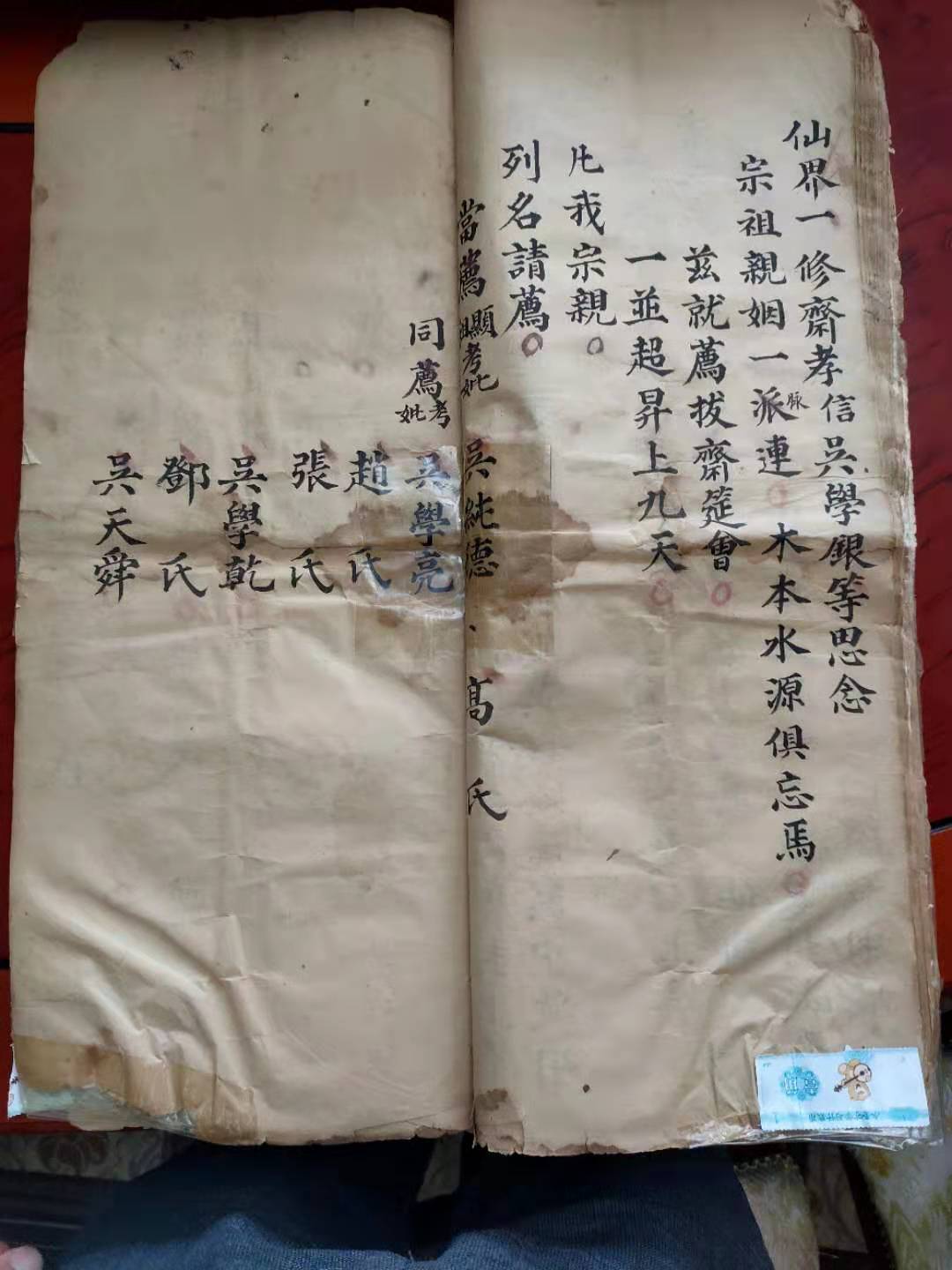 会议还邀请了金沙未找到根源的家亲吴荣方、吴荣江、吴华久、吴安龙作为列席代表,吴荣方把一百多年的经丹簿带到会场,大家打开一看,完全跟吴伯臣家族吻合,吴荣方自己说他是文字辈,父亲吴运科,爷爷吴开明,老祖吴天元,经丹簿记载他家属于牛路口所迁出。列席代表吴华久、吴安龙等也把自家世代流传下来的资料带到会场,大家一起研讨,暂未查出世系上源。