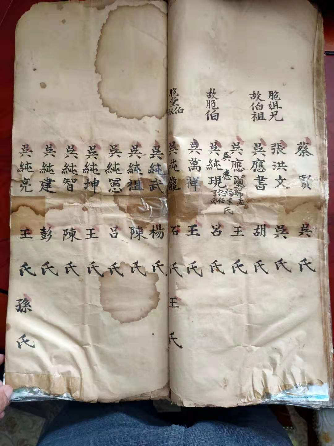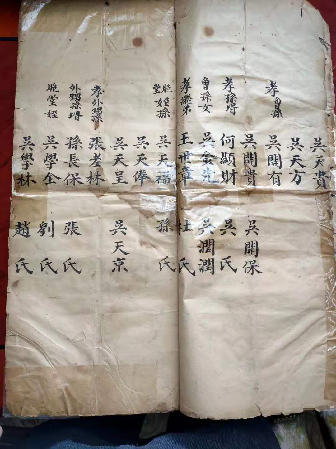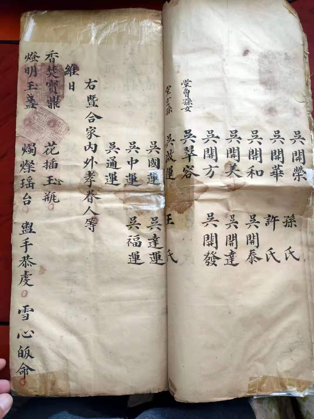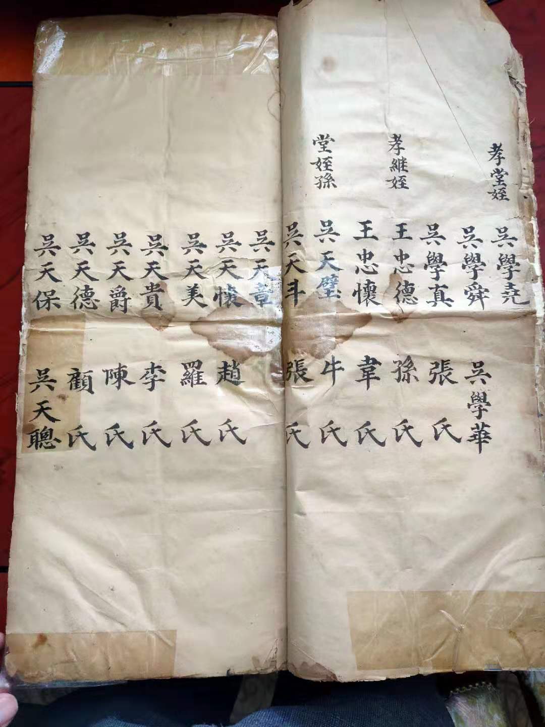 会议还邀请了金沙未找到根源的家亲吴荣方、吴荣江、吴华久、吴安龙作为列席代表,吴荣方把一百多年的经丹簿带到会场,大家打开一看,完全跟吴伯臣家族吻合,吴荣方自己说他是文字辈,父亲吴运科,爷爷吴开明,老祖吴天元,经丹簿记载他家属于牛路口所迁出。列席代表吴华久、吴安龙等也把自家世代流传下来的资料带到会场,大家一起研讨,暂未查出世系上源。