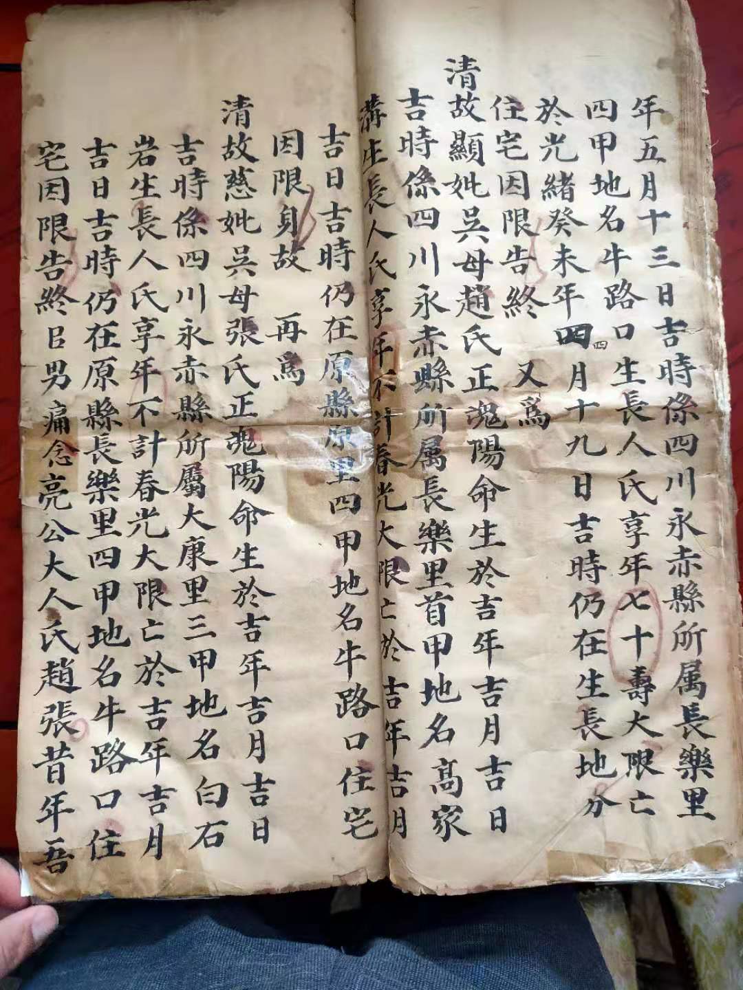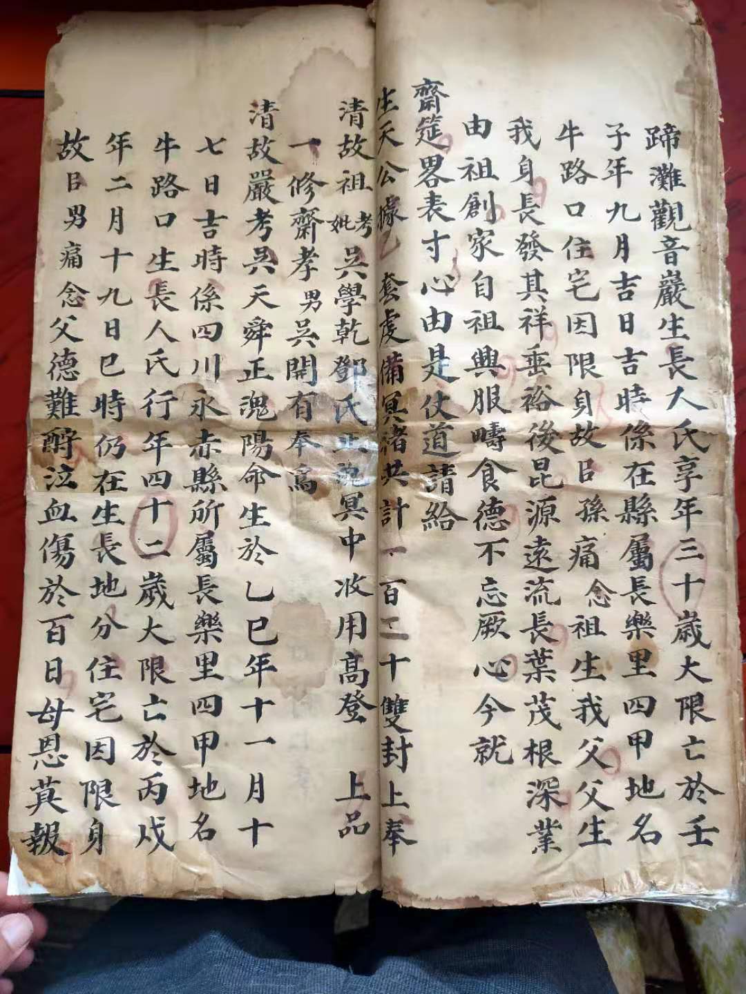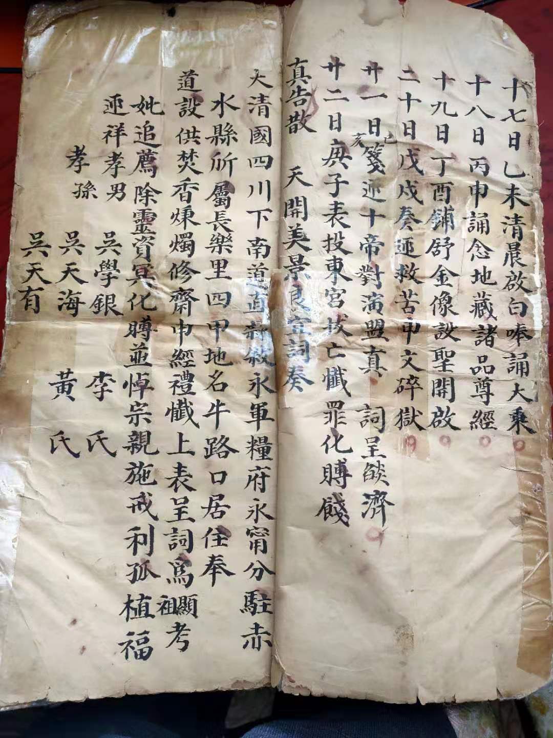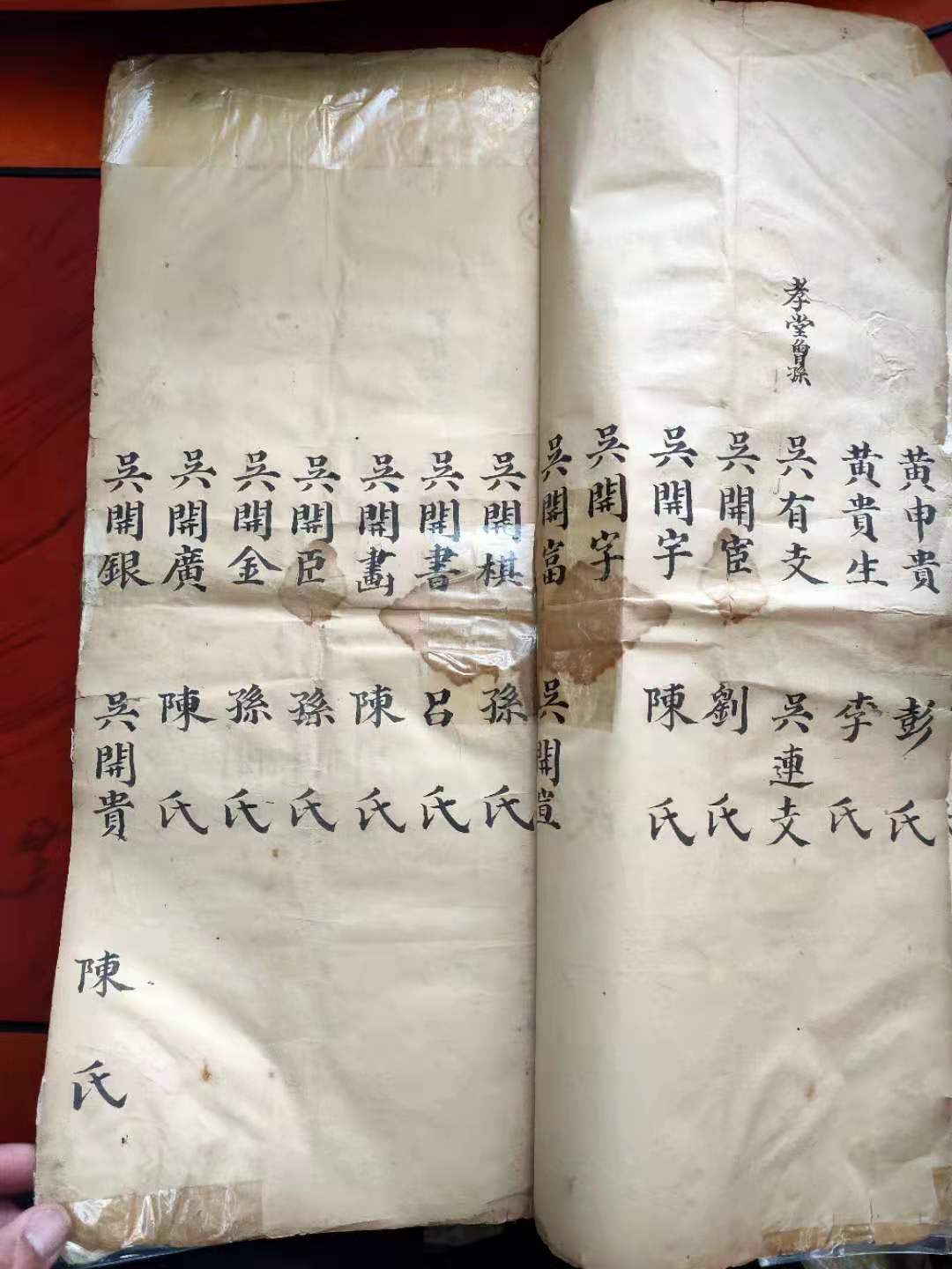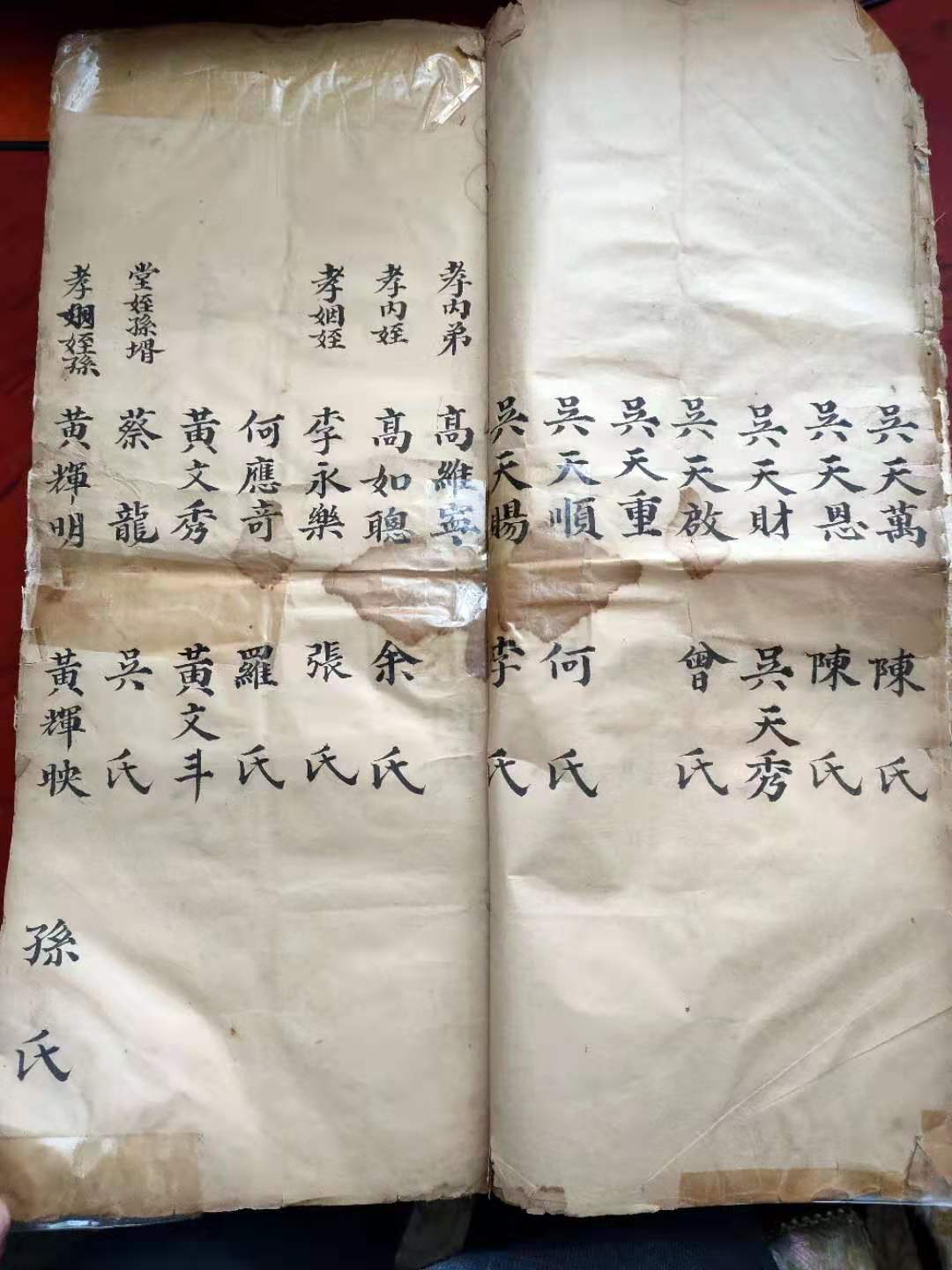 会议还邀请了金沙未找到根源的家亲吴荣方、吴荣江、吴华久、吴安龙作为列席代表,吴荣方把一百多年的经丹簿带到会场,大家打开一看,完全跟吴伯臣家族吻合,吴荣方自己说他是文字辈,父亲吴运科,爷爷吴开明,老祖吴天元,经丹簿记载他家属于牛路口所迁出。列席代表吴华久、吴安龙等也把自家世代流传下来的资料带到会场,大家一起研讨,暂未查出世系上源。