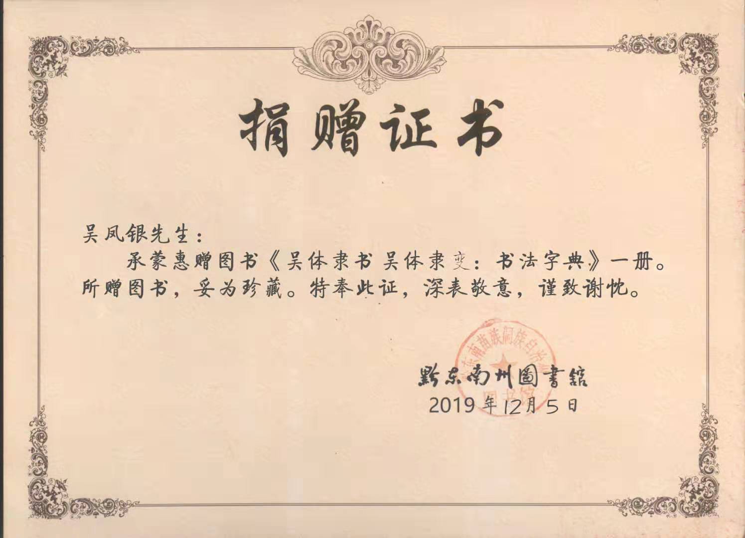 黑龙江省大庆市吴风银又名吴凤银〈中国当代实力派书法家、中国书法家协会会员、黑龙江省书法家协会会员、中国石油作家协会会员、"吴体隶书"和“吴体隶变”两种书体创始人)的委托,贵州远口吴氏总祠常务秘书长、黔东南至德文化研究会常务副会长吴礼宏代表吴风银宗长为贵州省黔东南州图书馆捐赠一册《吴体隶书吴体隶变书法字典》,州图书馆地方文献部主任(副研究馆员)代表州图书馆接受捐赠,并代表州图书馆对吴风银书法家、作家表示衷心感谢!