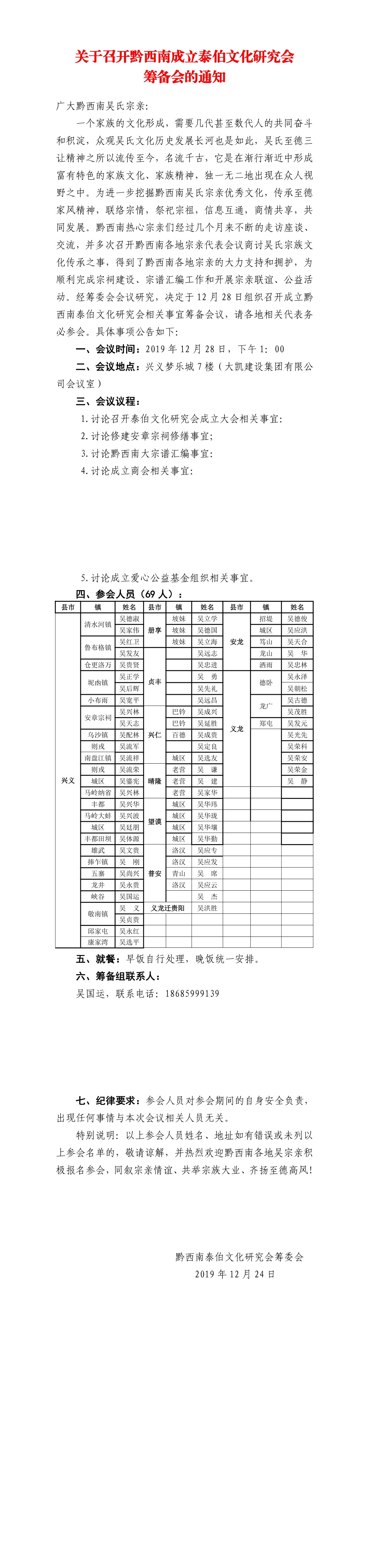 化传承之事,得到了黔西南各地宗亲的大力支持和拥护,为 顺利完成宗祠建设、宗谱汇编工作和开展宗亲联谊、公益活 动。经筹委会会议研究,决定于 12 月 28 日组织召开成立黔 西南泰伯文化研究会相关事宜筹备会议,请各地相关代表务