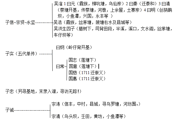 由于子诚是单传,明纪公只生了这么一个儿子,他是有抱负的,这点在早期的墓葬可以看出,如子诚自已墓葬剑山下蜘蛛形辰山戍向,是取罗盘之分金点占山头形状而命名,荣公长子晓翠葬天主任天主乘凤形,这也就是我族著名的佳话出天主之墓点,至今也引为墓地精华胜地,华公葬老鼠攻仓,定琪葬牛牯洞象形,国德葬大坑红朱岽龙形癸山丁向,形式之豪华,无不让人叹为观止,谱书记载8世之内巳乎铺背以西北,无一不是吴家领地,然后在8至13世左右,出现了大量的每户五丁现象,由于国运衰弱,民不聊生,多数遭饿死和各姓迫害,随后宗清后裔国仲迁居,致使铺背,牛牯洞,大坑,剑山下大片土地失手随撒另姓手中,谱书中后来无一葬于上地者。