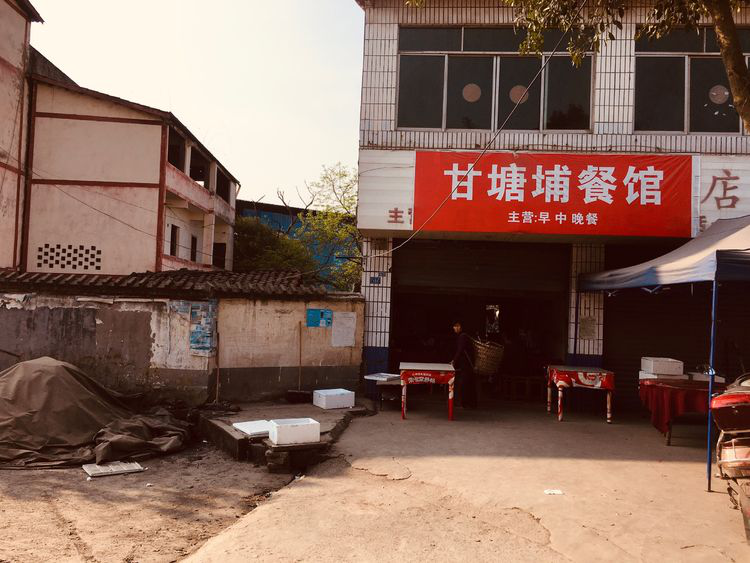 去找姜德良的路上,在大桥路131号处,看到一个门市,上面赫然写有“甘塘埔餐馆”店招。店前有几个人在闲谈,我们上前打招呼,问他们是否知道甘棠书院的事情。其中一位年龄较大的妇女周庭琼马上就开始介绍,她指着店旁的低矮破旧的瓦房说,这就是甘棠书院。我们穿过这个“甘塘埔餐馆”往里面看到刚才低矮破旧瓦房里面的情况,里面的房子是土墙,空地多,有人造的小路,砖砌的小房,空地养有鸡鸭。周廷琼说,这里是个坡坡,前面有条河,以前旁边有一条小河沟(就是甘棠溪,甘棠书院因此名取),但已填了,看不出有小河沟,这条小河沟是从正大饲料厂方向流向大河的,我问她这条大河是不是叫海棠溪。她说就是。我问这小河沟叫什么名字,她说就不知道了。