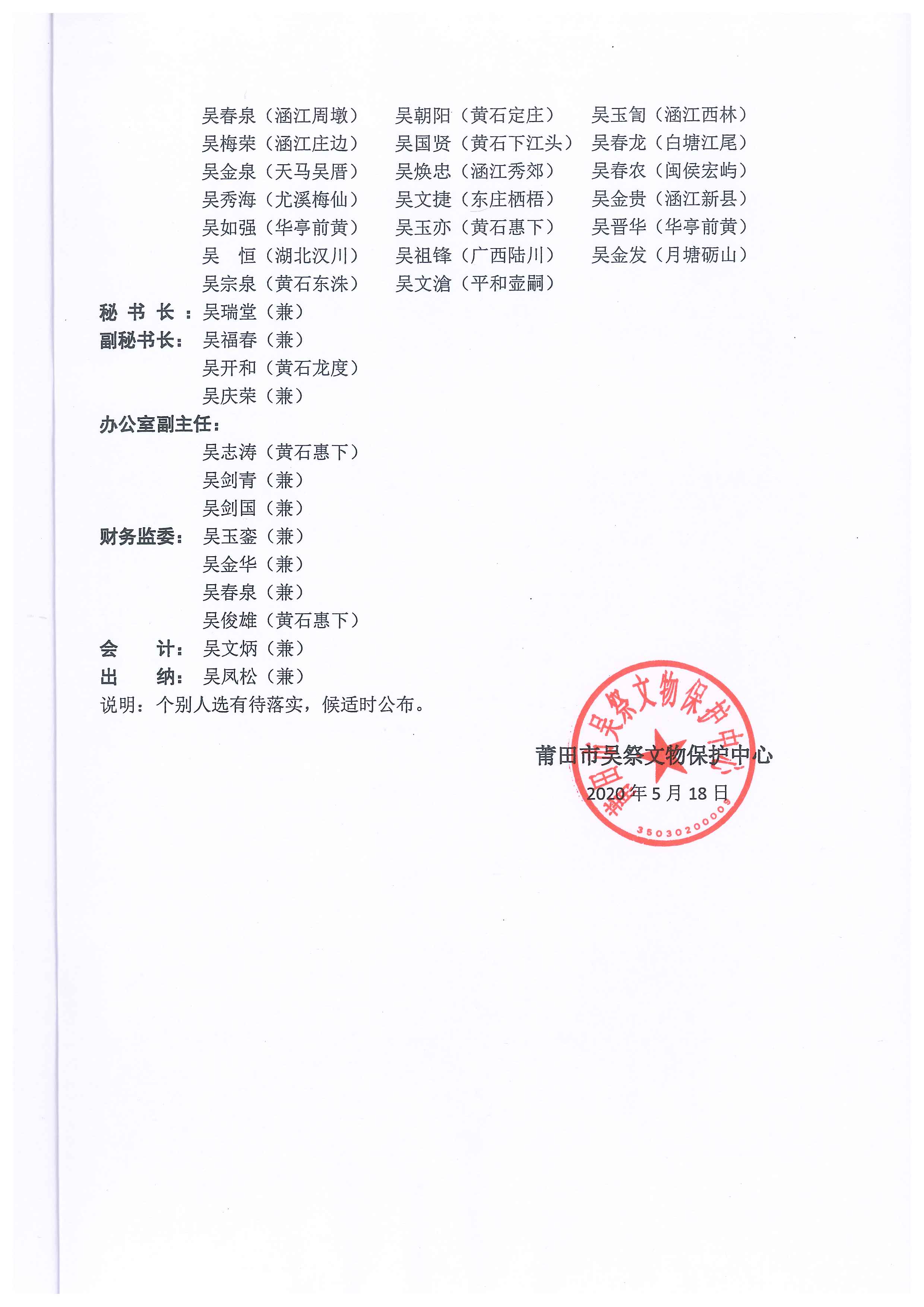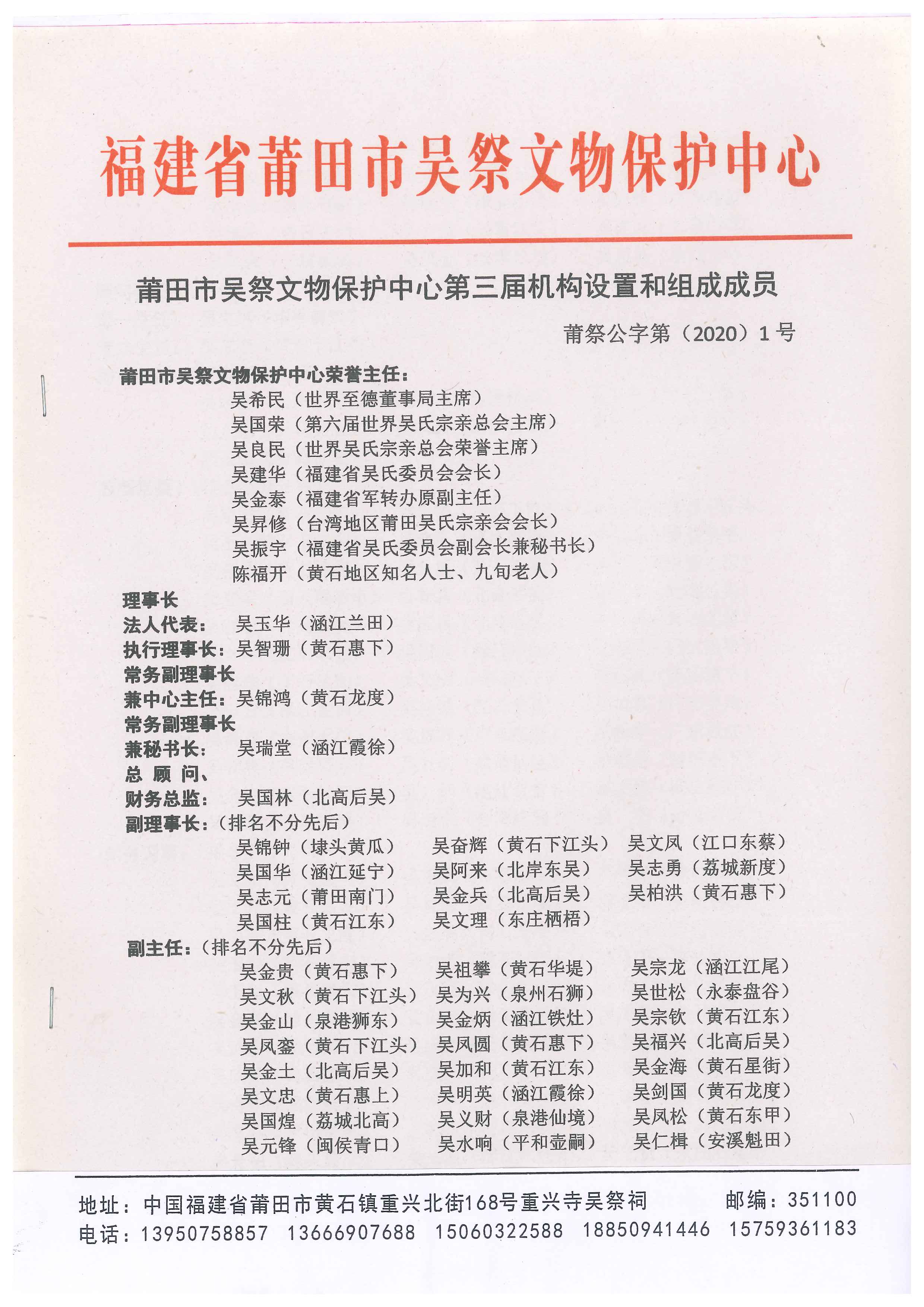 5月18日,福建省莆田市吴祭文物保护中心第三届机构设置和组成成员。