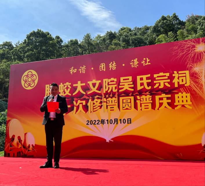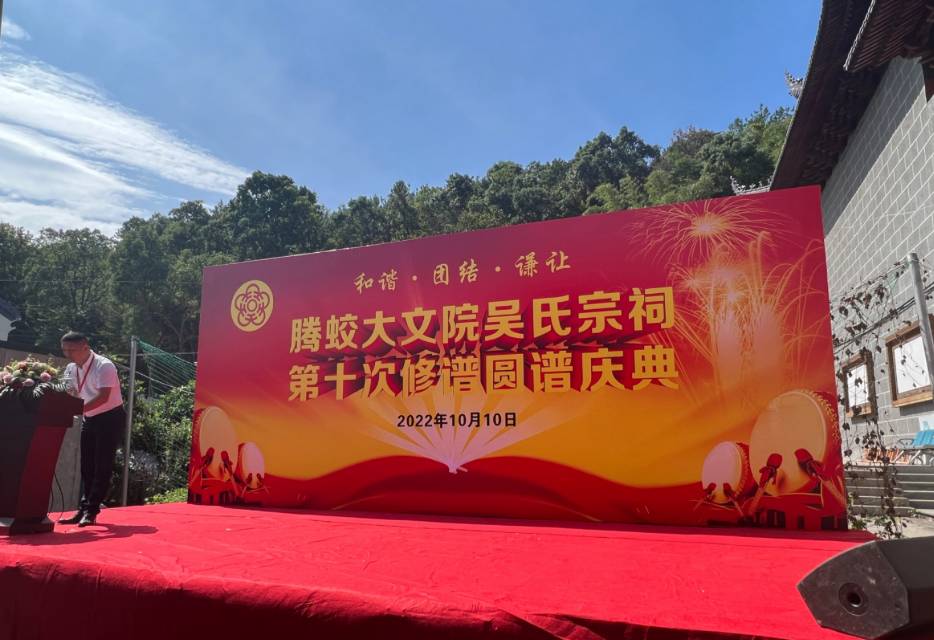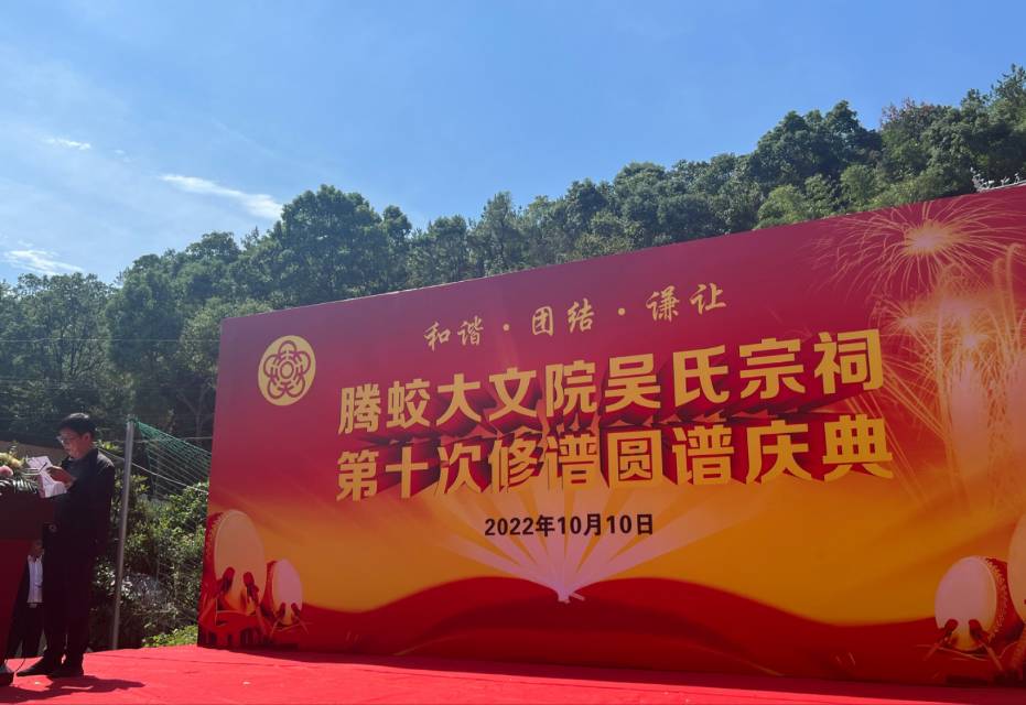 2022年10月10,温州腾蛟大文院吴氏宗祠举行第十次修谱圆谱庆典活动,在美丽的腾跤大文院吴氏宗祠隆重举行,金秋十月 情满吴氏,各地吴氏代表早早来到大文院吴氏宗祠见证第十次圆谱庆典,此次圆谱完善了腾蛟各地吴氏宗亲及时编入族谱,理清吴氏支派源流,代代传承,弘扬中华民族传统文化特色。