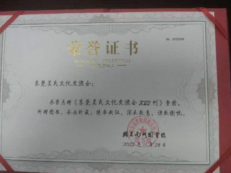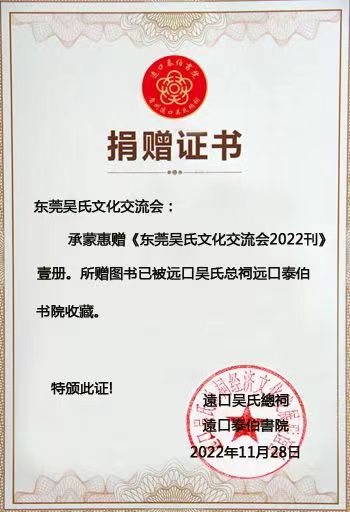 2022年11月27日下午,贵州远口吴氏总祠常务秘书长、远口泰伯书院秘书长吴礼宏收到东莞吴文化研究会吴丽萍秘书长邮寄过来的《莞吴会会刊》会刊,受到莞吴会的委托代表莞吴会将书捐赠到州图书馆和远口泰伯书院等单位及团体和个人。