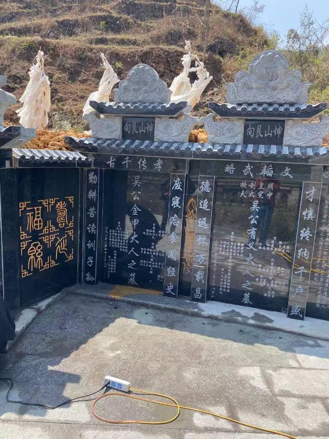 本次修缮祖坟,碑石选用花岗岩黑水晶石,坟石与坟前地板用花岗岩芝麻白。