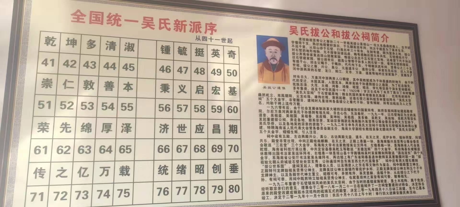 万湖浪高源渤海,千枝叶茂本开封。拔公祖后裔子孙满堂,五湖四海,遍布海南岛琼海、琼山、海口、三亚、万事如意、屯昌、定安、澄迈等十三市县,其子孙人口三十多万。双龙吐珠登金榜,凰鸟朝阳攀高坛。拔公祖贤子望孙,代代杰出,文学家、艺术家、科学家、经济学家、企业家等等人才辈出,魅力无穷,威震海内外。