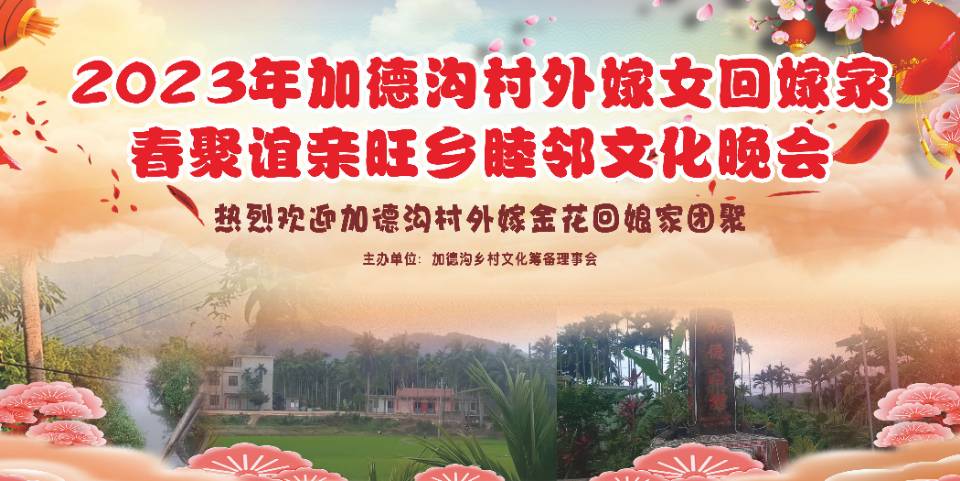 2023年琼海市石壁镇加德沟村外嫁女回娘家春聚谊亲旺乡睦邻文化活动(时间:2023年2月11日晚至12日晚)。主办单位:加德沟乡村文化活动筹备理事会。
