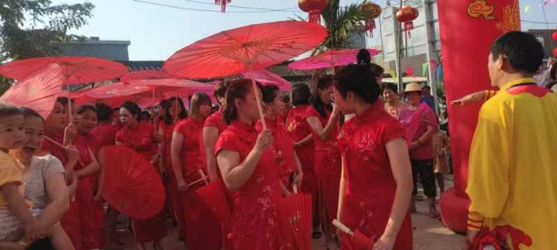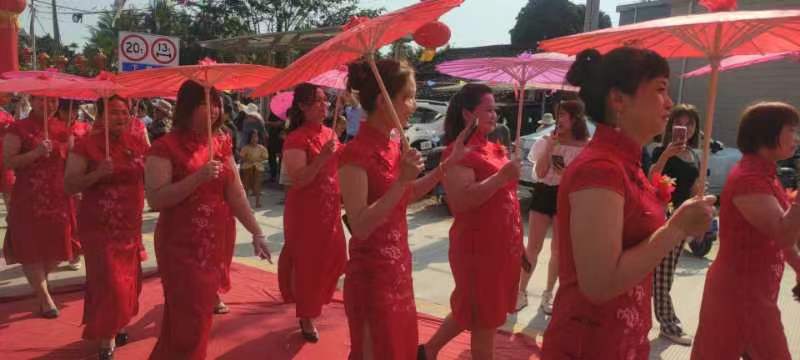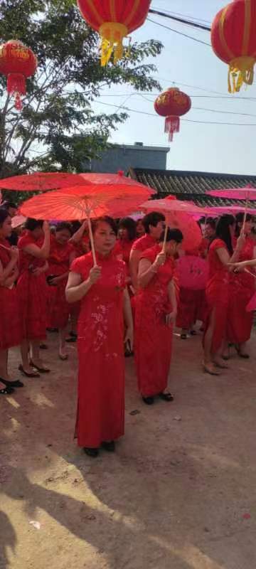 正月廿二(2月12日)清晨九点半,加德沟村外嫁女,从加德沟大桥头边集中地开始出发,锣鼓喧天,狮舞引路,逾百名外嫁女身着红旗袍,手握金花伞,肩挑回娘家探亲礼物,口唤爱家爱乡爱国语,神采飞扬,浩浩荡荡,沿着家乡加德沟大道,向家乡加德沟梨园文化广场,缓缓行走。犹如两条相称绵长的红色巨龙,祥腾蛇舞,阵容浩瀚,翻江倒海,画卷恢宏。