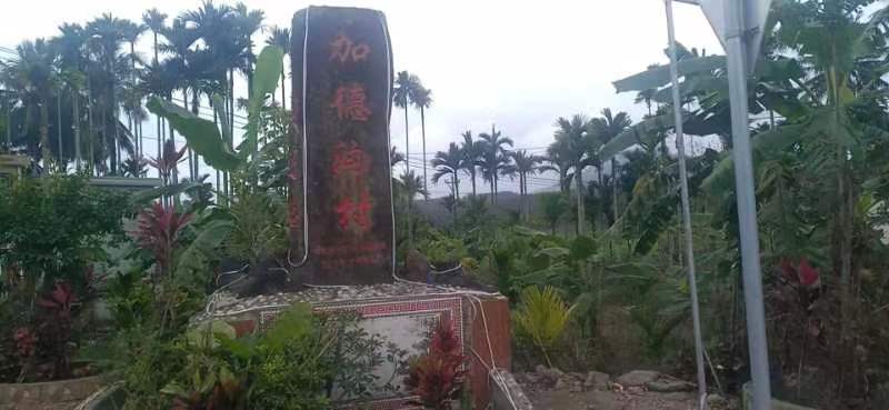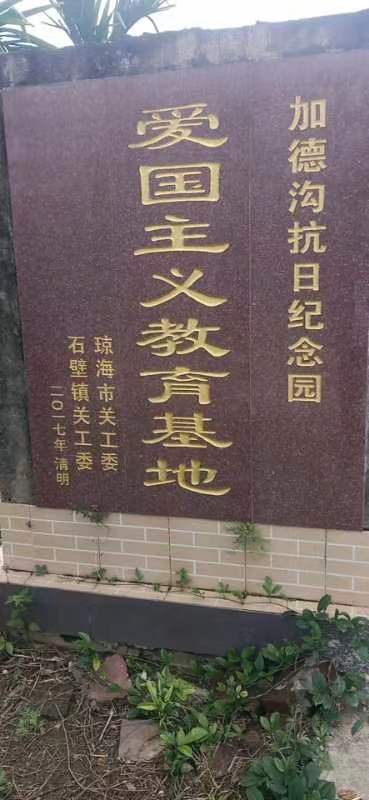 忆往昔,峥嵘岁月稠。南岛烽火泻天红,万泉河畔弹雨骤。加德沟村东侧的赤面岭上,琼崖革命斗争的战火熊熊燃烧,陈文斋排长临危不惧,采取诱敌深入、迂迴周旋、步步为营的孙子兵法战术,最后在指挥和带领部队与日本鬼子敌人的激烈战斗中壮烈牺牲。赤面岭战役的胜利,是无数革命烈士用赤红的鲜血染红的一面光辉旗帜。已离世的曾经参加过母瑞山、赤面岭等地与敌人战斗的琼崖革命斗争老兵加德沟村蔡用海名贤,经常对加德沟村民众与社会人士讲述赤面岭战役的激烈战斗最终取得胜利的可歌可泣的壮烈场面,为我们的子孙后代撒播红色革命种子。他永垂不朽,他是我们加德沟村永不褪色的红色基因和象征。加德沟村通往加德沟桥大道间旁,禀然挺立的 ”抗日纪念亭”,是我们加德沟村民众心中一座巍巍的永恒的丰碑。