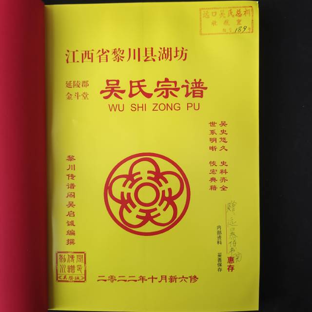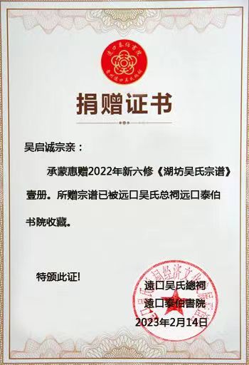 2023年2月14日,江西省抚州市黎川县湖坊乡吴氏后裔吴启诚捐赠谱书《江西省黎川县湖坊吴氏宗谱》一部给贵州远口泰伯书院收藏。