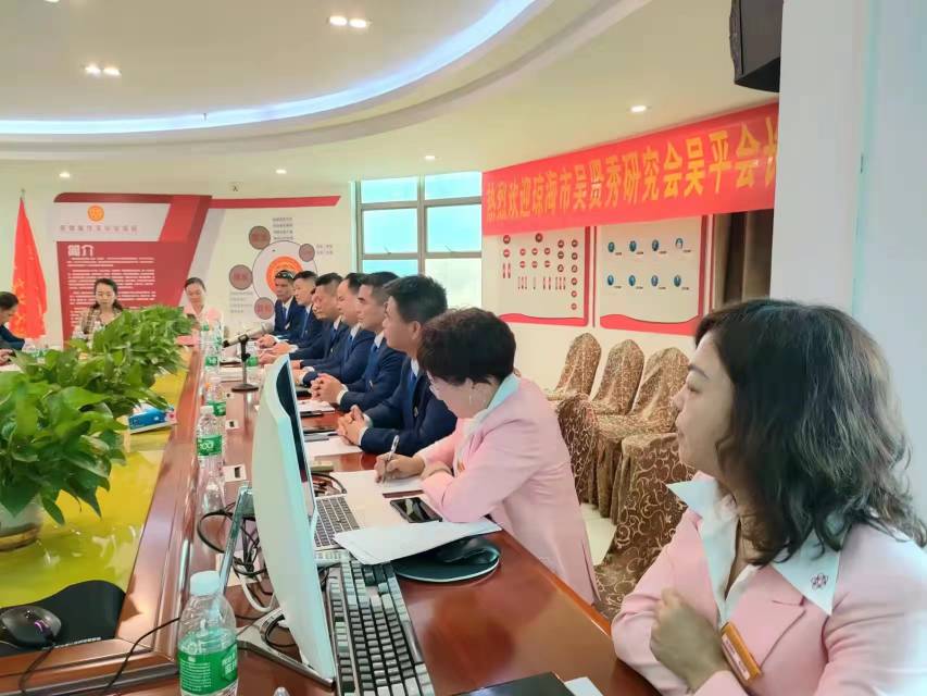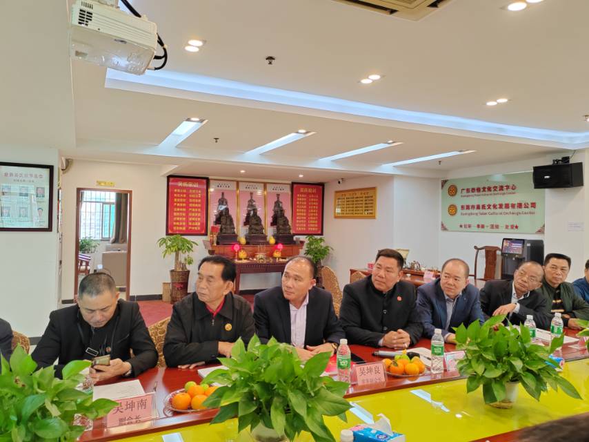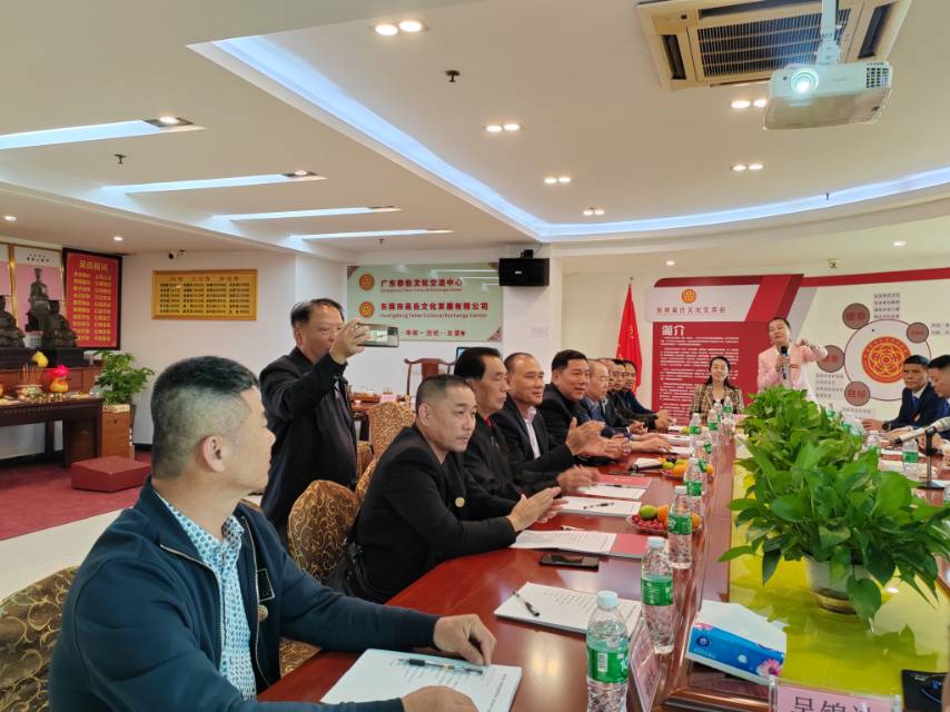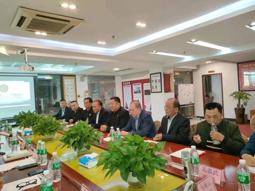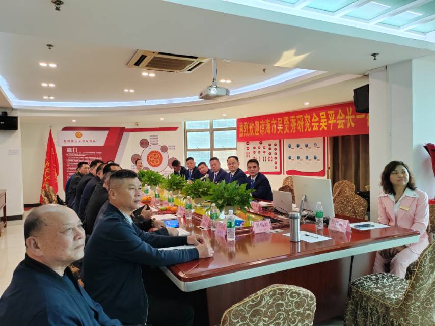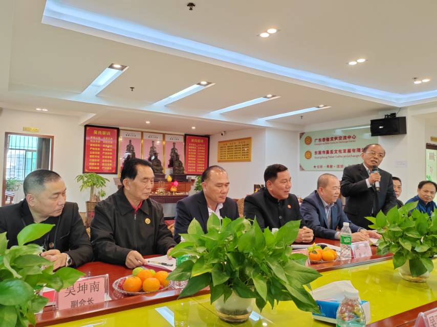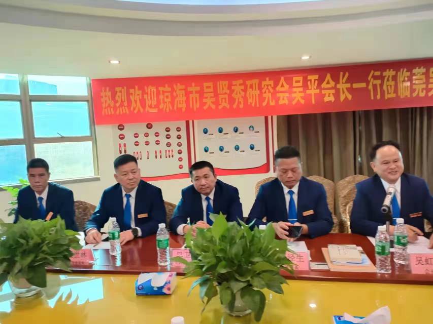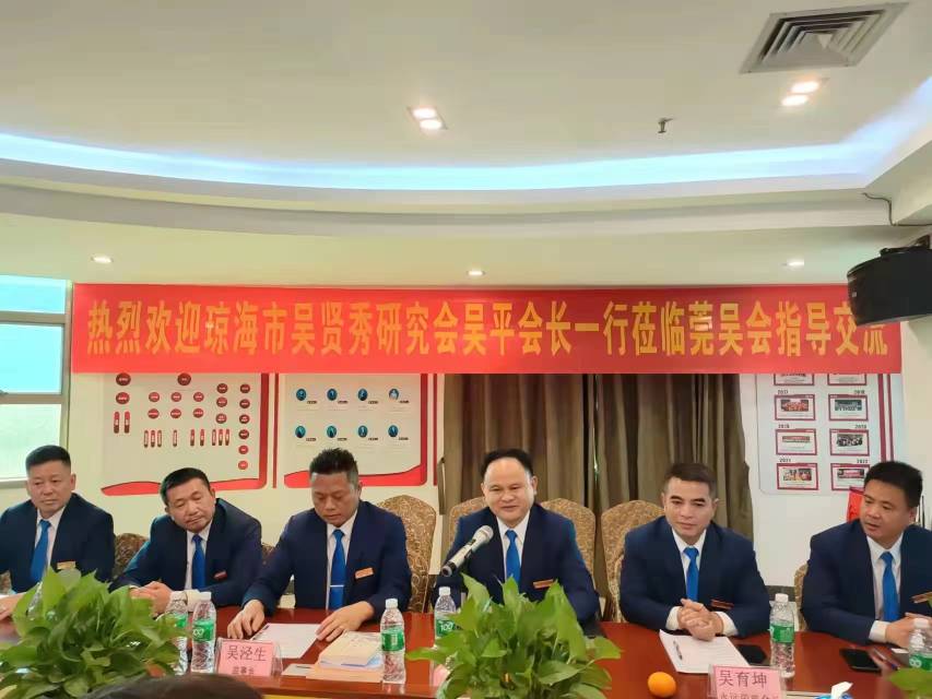 东莞吴氏文化交流会秘书长吴丽萍主持座谈交流会,首先介绍莞吴会参会人员:东莞吴氏文化交流会会长吴虹渊、永远荣誉会长吴育坤、永远荣誉会长吴铭煜、监事长吴泾生、秘书长吴丽萍、城区片区区长吴卫锋、名誉会长吴恩铁、顾问吴锦波、常务副会长吴世林、理事吴明生、办公室主任吴月荷。琼海市吴贤秀研究会并琼海泰伯书院(筹)秘书长吴金芳介绍拜访学习莞吴会人员:琼海市吴贤秀研究会会长、琼海泰伯书院(筹)院长吴平、常务副会长吴坤良、吴茂泽、吴川、副会长及宗亲人员吴家才、吴坤南、吴达程、吴忠武、吴景书。东莞吴氏文化交流会会长吴虹渊致欢迎词,并介绍莞吴会的宗亲工作和吴文化建设发展情况及成功经验。琼海市吴贤秀研究会会长、琼海泰伯书院(筹)院长吴平坦言,琼海吴氏会大家一行,是怀着向莞吴会学习而来,感谢感恩而来,具体汇报琼海吴氏宗亲工作和吴文化建设发展情况,重点介绍和汇报琼海泰伯书院(筹)、海南(琼海)吴氏文化陈列馆(初级阶段版)建设与发展具体情况,指出琼海吴氏宗亲工作的体现是,坚持以农村包围城市的路线方针,吴氏大厦建家、居家、兴家、安家建设过程等。东莞吴氏文化交流会荣誉会长吴育坤、琼海市吴贤秀研究会并琼海泰伯书院(筹)秘书长吴金芳,分别发言。