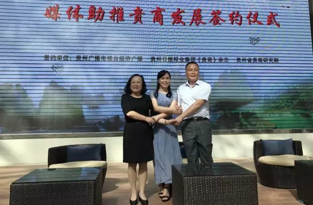 节目最后,贵州广播电视台经济广播总监杨 虹、贵州日报报业集团《贵商》杂志副总编辑胡燕妮、贵州省贵商研究院秘书长杨敢共同签署了“媒体助推贵商发展签约仪式”。