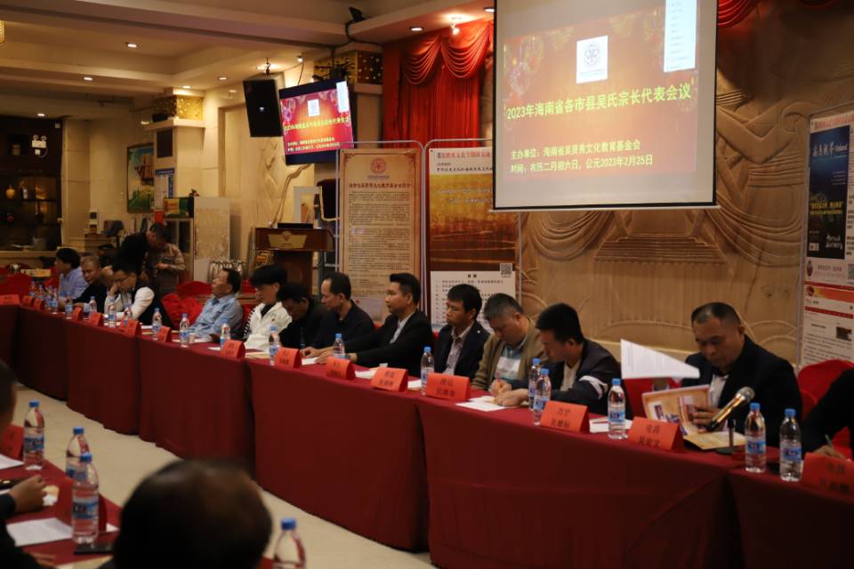 2023年2月25日,海南省吴贤秀文化教育基金会在海口市召开海南省全省各市县宗长代表会议。海口、三亚、儋州、琼海、三沙、文昌、万宁、东方、五指山、澄迈、临高、定安、屯昌、琼中、白沙、昌江、陵水、保亭、乐东等十九个市县宗亲宗长代表,省吴贤秀文化教育基金会永远名誉理事长吴亚荣,各位副理事长、邀请嘉宾及宗贤近八十人出席了会议。